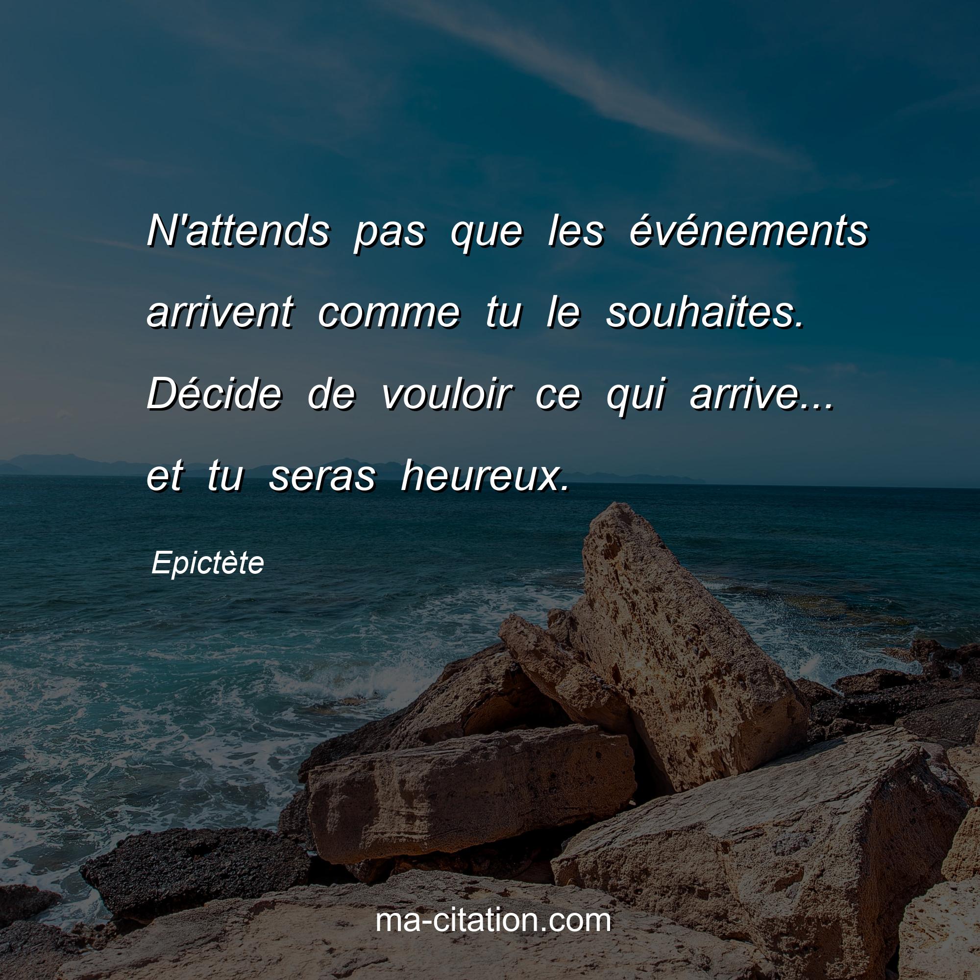 Citation sur la vie d'Epictète :N'attends pas que les événements arrivent comme tu le souhaites. Décide de vouloir ce qui arrive... et tu seras heureux.