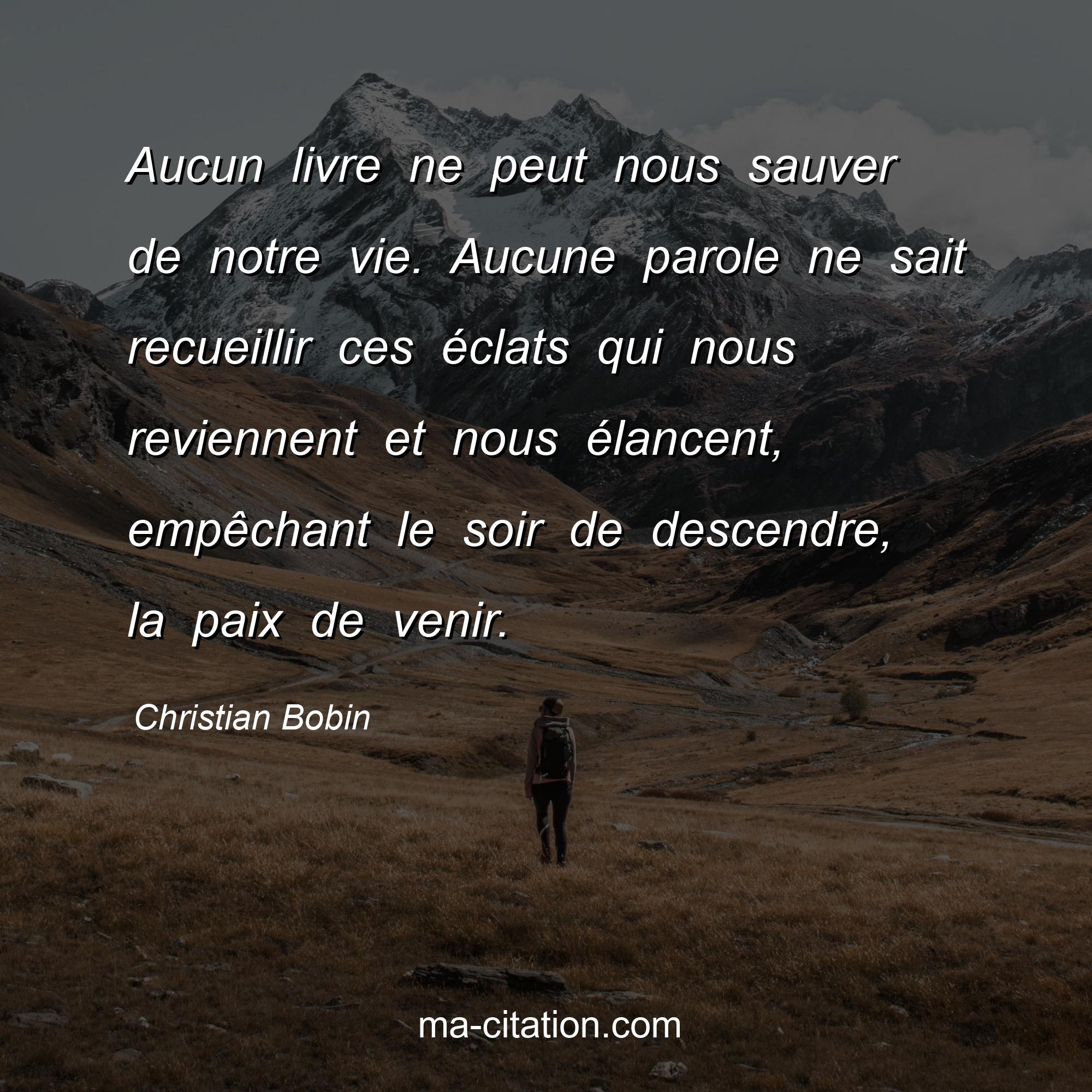 Citation sur la vie de Christian Bobin :Aucun livre ne peut nous sauver de notre vie. Aucune parole ne sait recueillir ces éclats qui nous reviennent et nous élancent, empêchant le soir de descendre, la paix de venir.