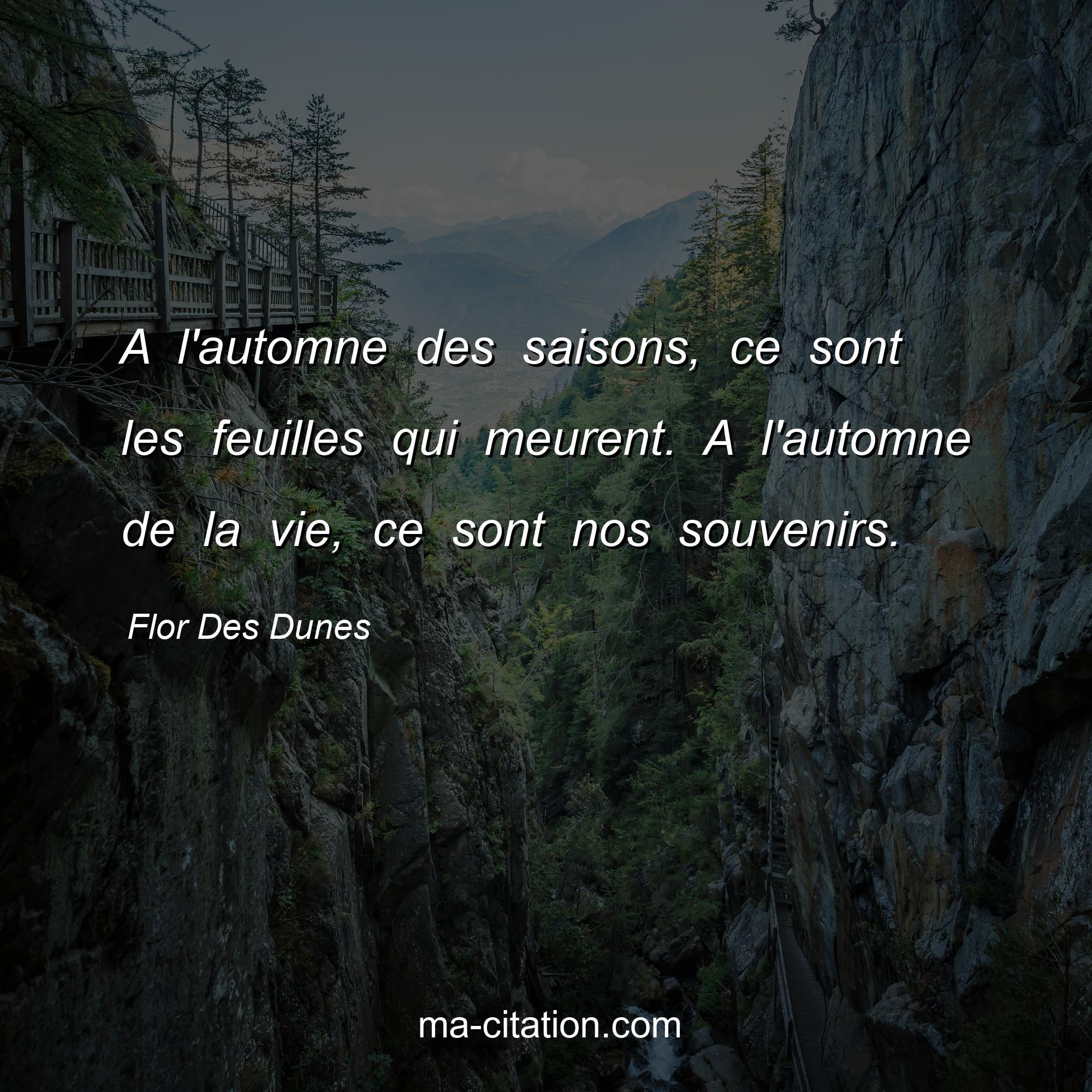 Citation sur la vie de Flor Des Dunes :A l'automne des saisons, ce sont les feuilles qui meurent. A l'automne de la vie, ce sont nos souvenirs.