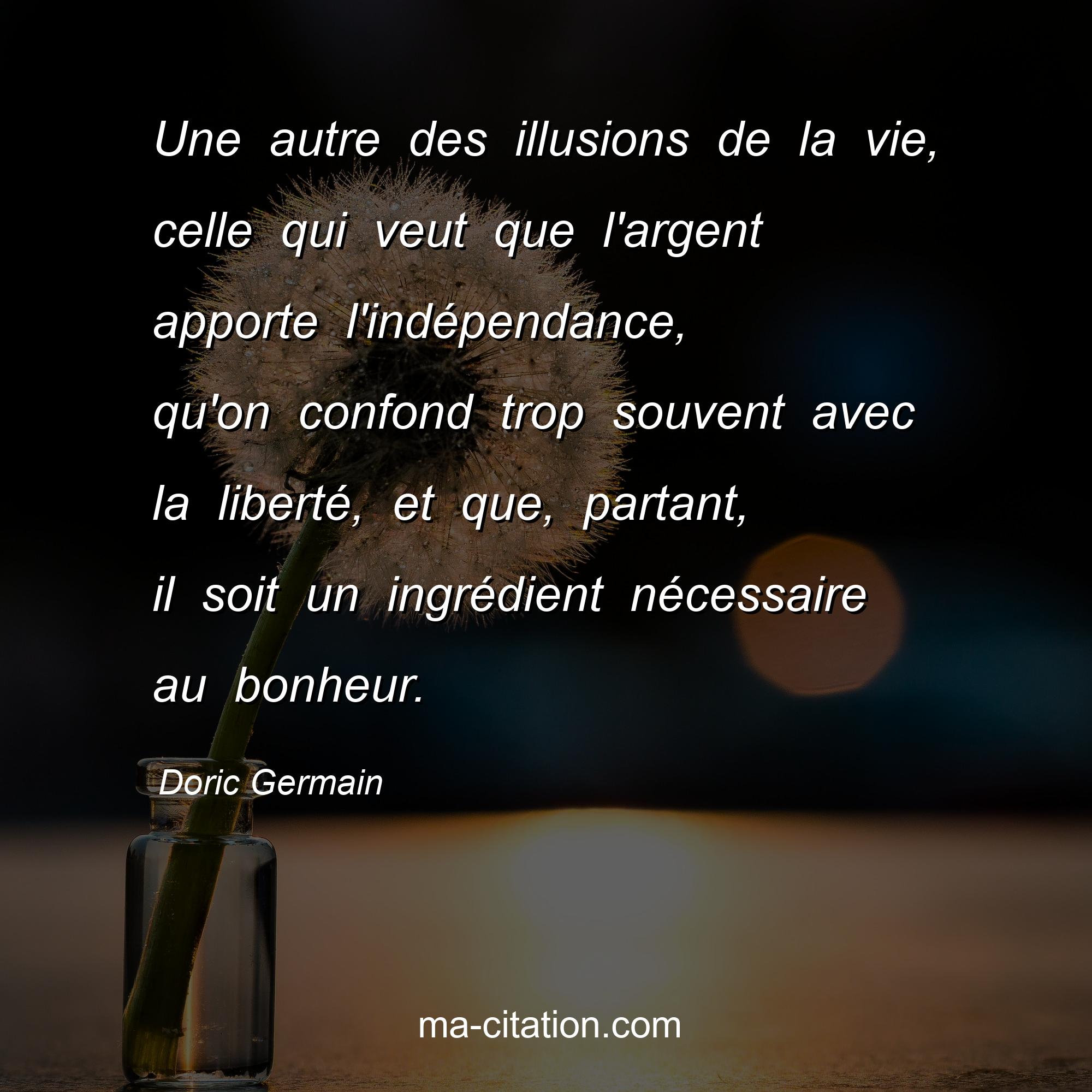 Citation sur la vie de Doric Germain :Une autre des illusions de la vie, celle qui veut que l'argent apporte l'indépendance, qu'on confond trop souvent avec la liberté, et que, partant, il soit un ingrédient nécessaire au bonheur.