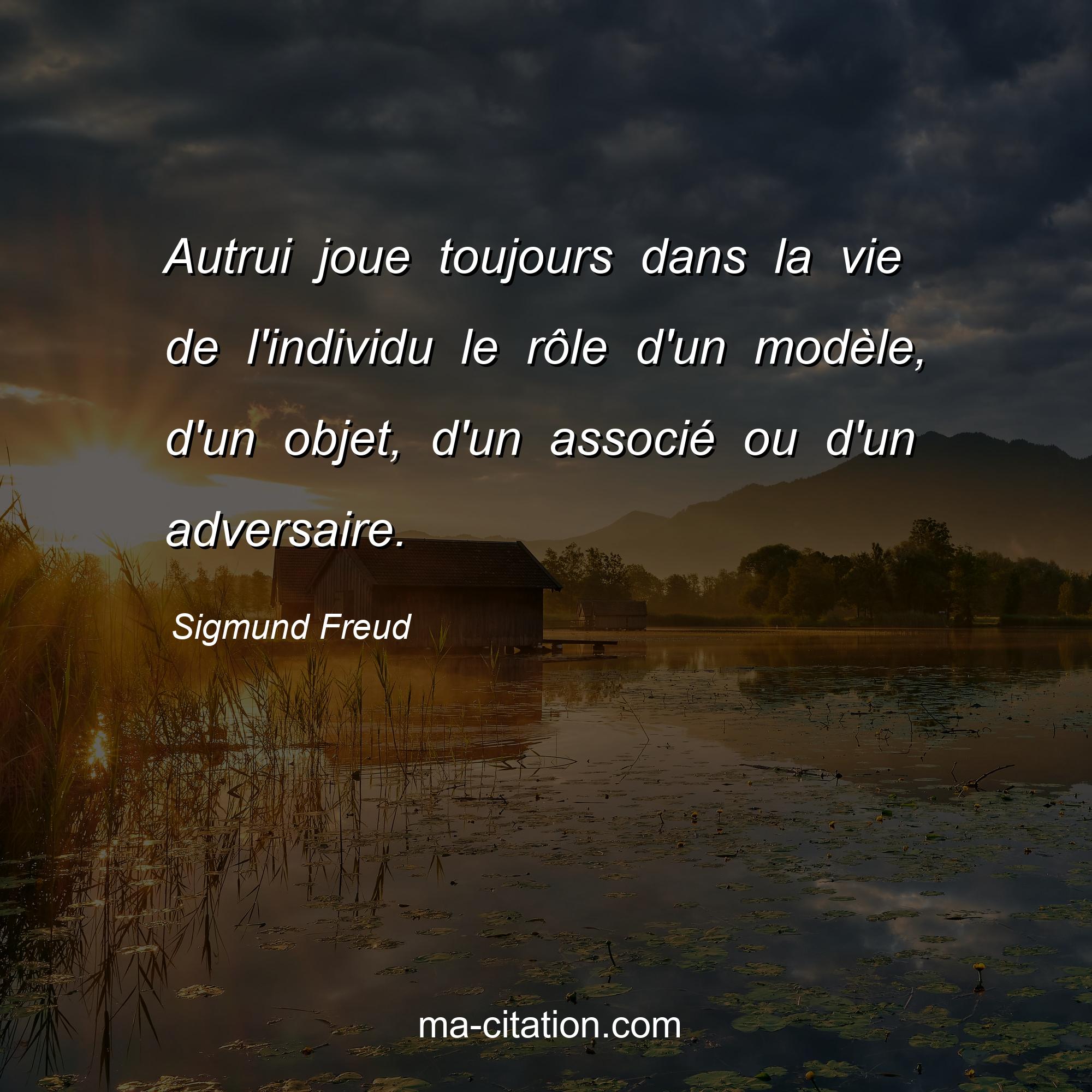 Citation sur la vie de Sigmund Freud :Autrui joue toujours dans la vie de l'individu le rôle d'un modèle, d'un objet, d'un associé ou d'un adversaire.