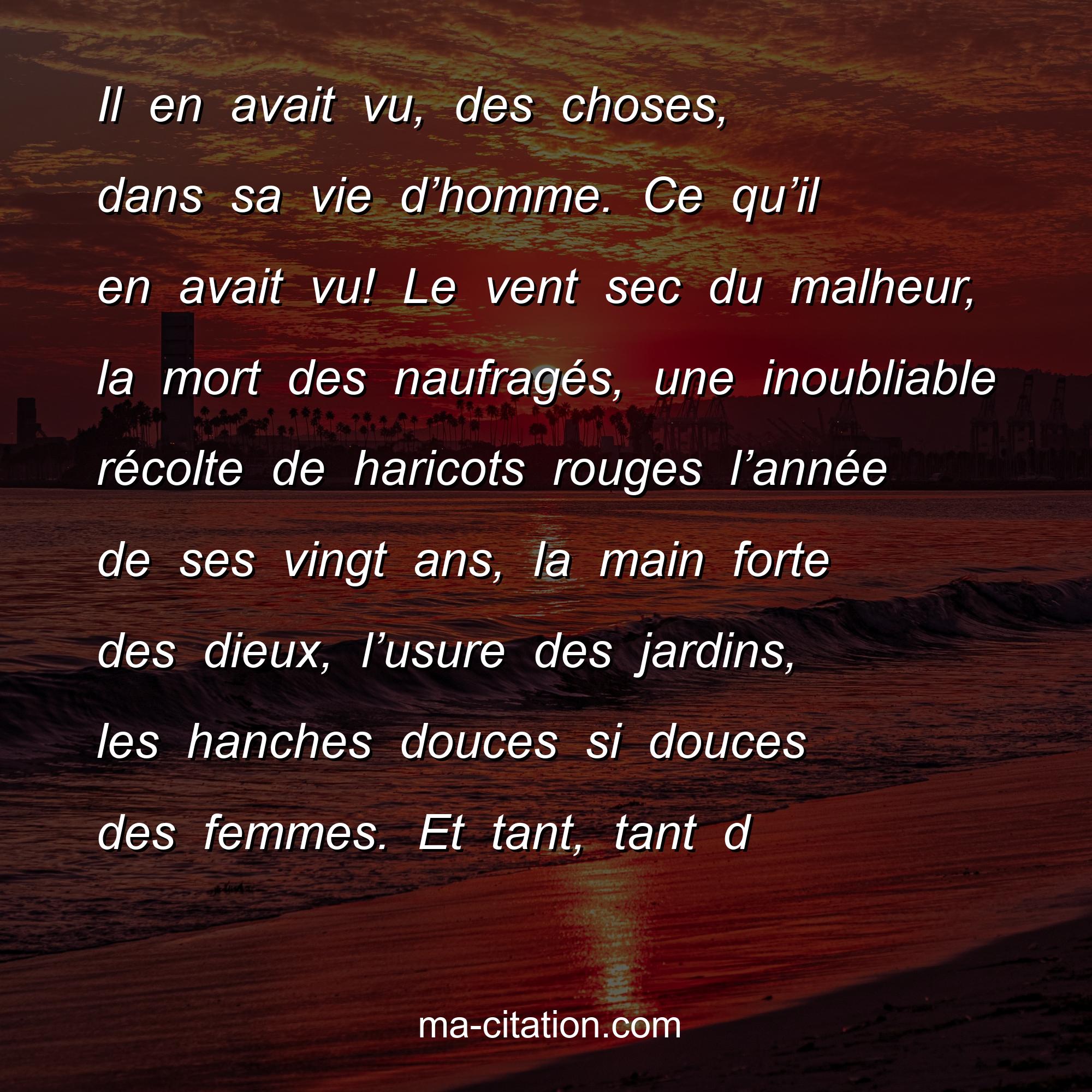Il en avait vu, des choses, dans sa vie d’homme. Ce qu’il en avait vu! Le vent sec du malheur, la mort des naufragés, une inoubliable récolte de haricots rouges l’année de ses vingt ans, la main forte des dieux, l’usure des jardins, les hanches douces si douces des femmes. Et tant, tant d