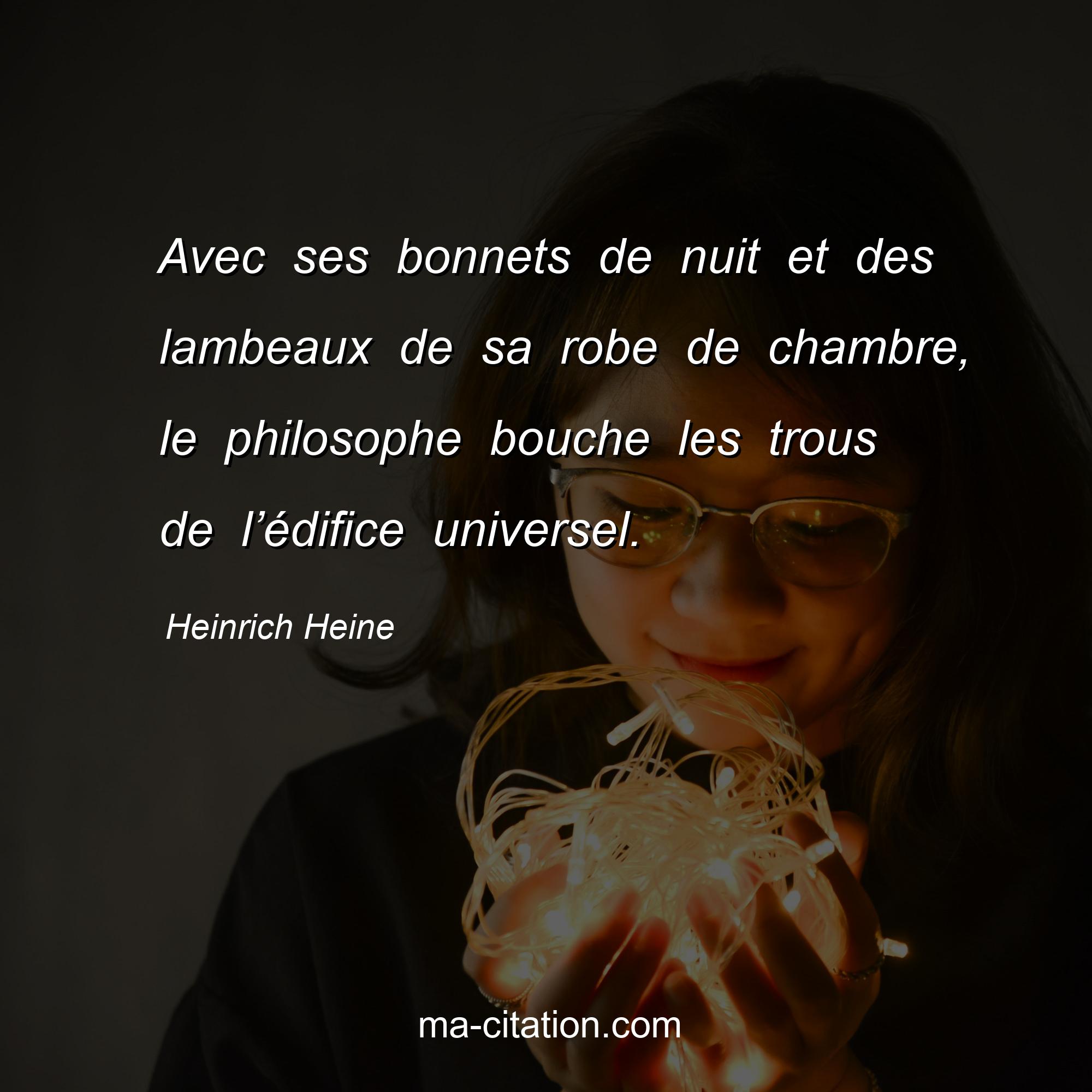 Citation sur la vie de Heinrich Heine :Avec ses bonnets de nuit et des lambeaux de sa robe de chambre, le philosophe bouche les trous de l’édifice universel.