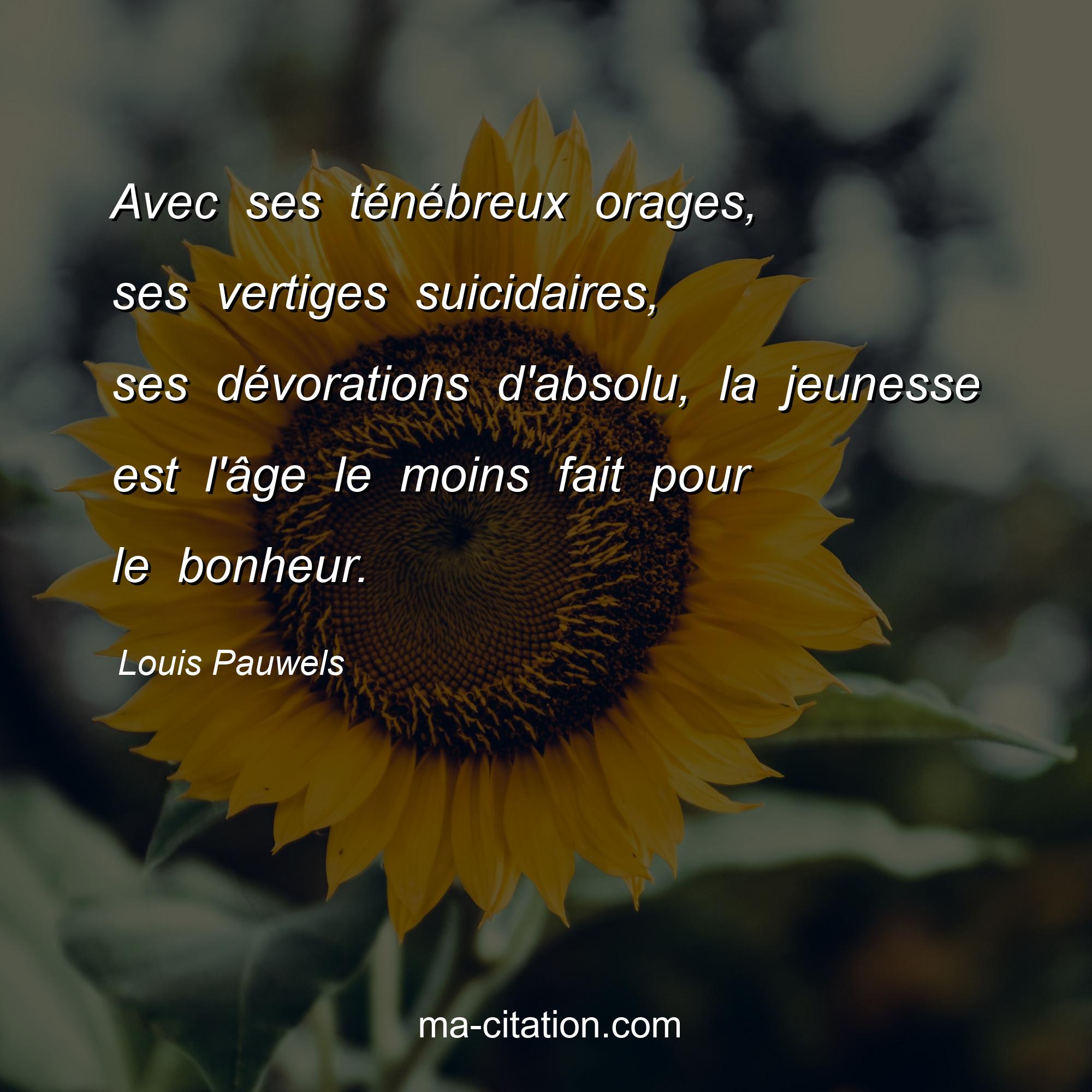 Citation sur la vie de Louis Pauwels :Avec ses ténébreux orages, ses vertiges suicidaires, ses dévorations d'absolu, la jeunesse est l'âge le moins fait pour le bonheur.