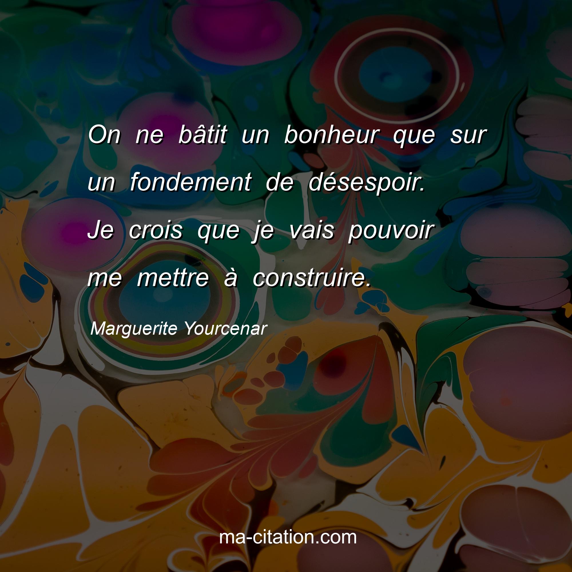 Marguerite Yourcenar est l'auteur de la citation sur la vie "On ne bâtit un bonheur que sur un fondement de désespoir. Je crois que je vais pouvoir me mettre à construire.".