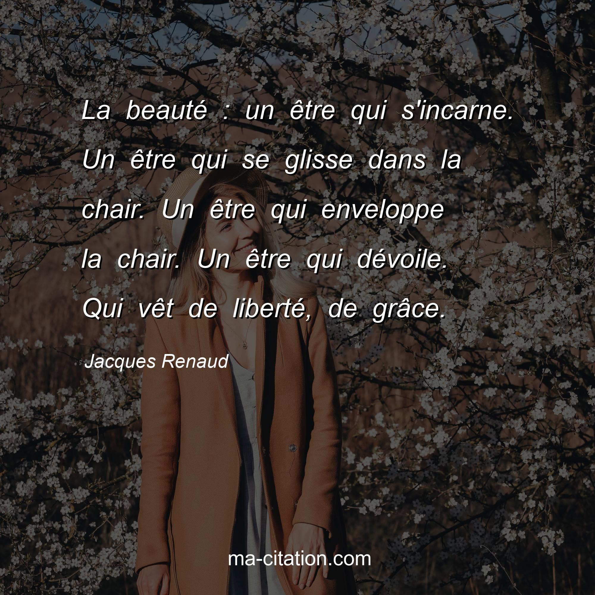 Jacques Renaud est l'auteur de la citation sur la vie "La beauté : un être qui s'incarne. Un être qui se glisse dans la chair. Un être qui enveloppe la chair. Un être qui dévoile. Qui vêt de liberté, de grâce.".