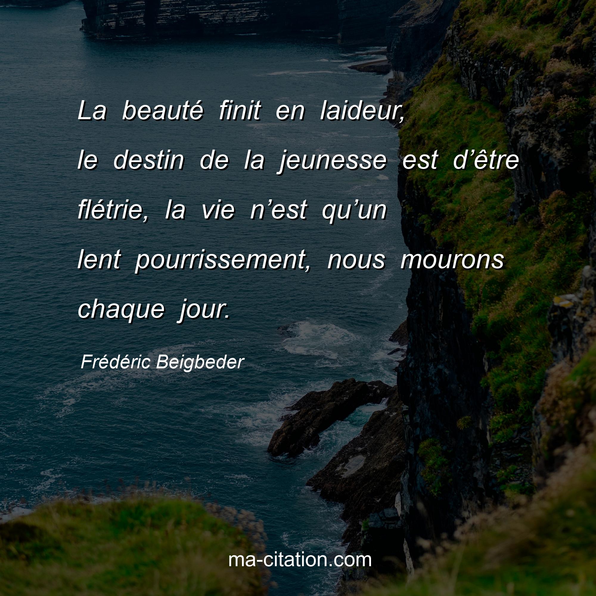 Frédéric Beigbeder est l'auteur de la citation sur la vie "La beauté finit en laideur, le destin de la jeunesse est d’être flétrie, la vie n’est qu’un lent pourrissement, nous mourons chaque jour.".
