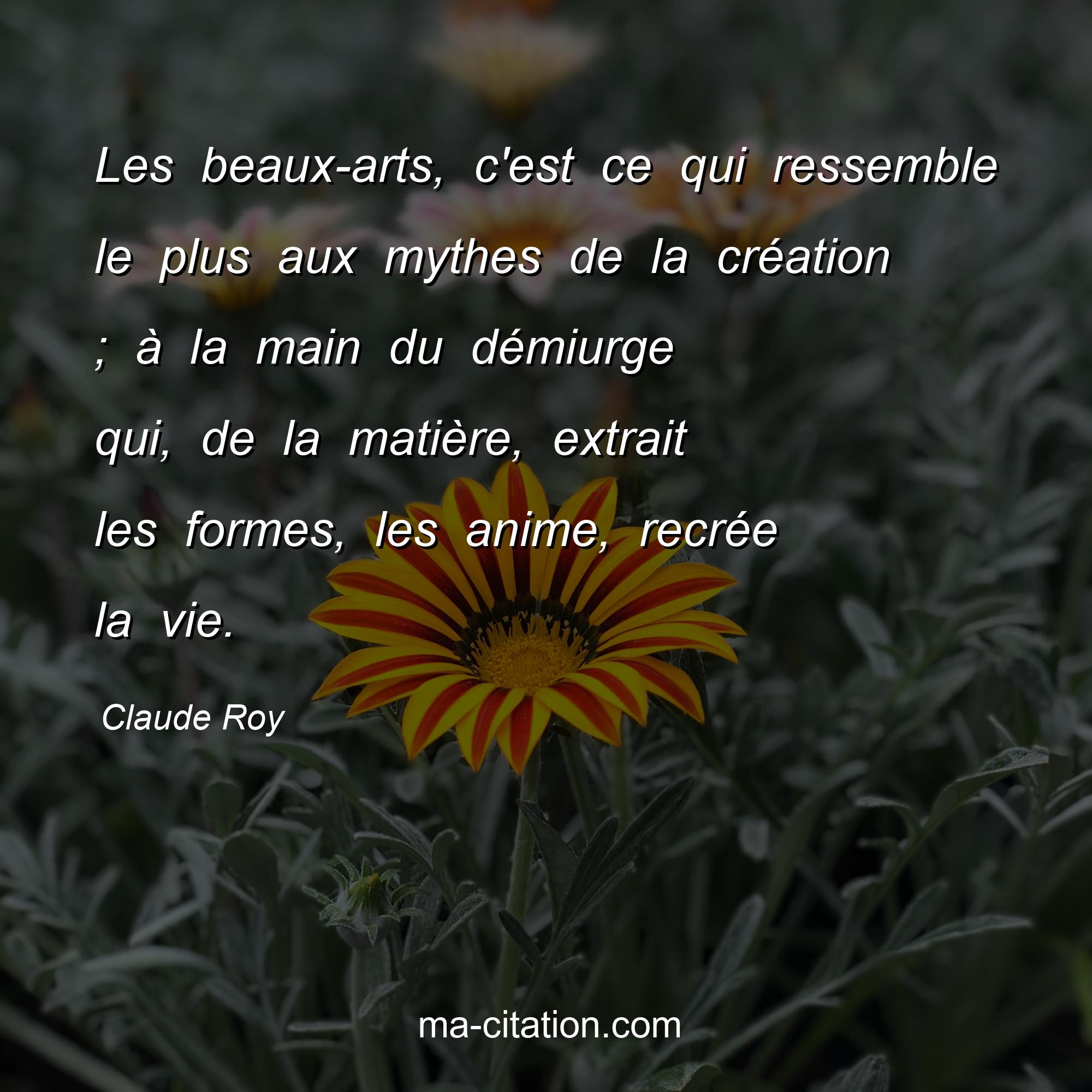 Citation sur la vie de Claude Roy :Les beaux-arts, c'est ce qui ressemble le plus aux mythes de la création ; à la main du démiurge qui, de la matière, extrait les formes, les anime, recrée la vie.