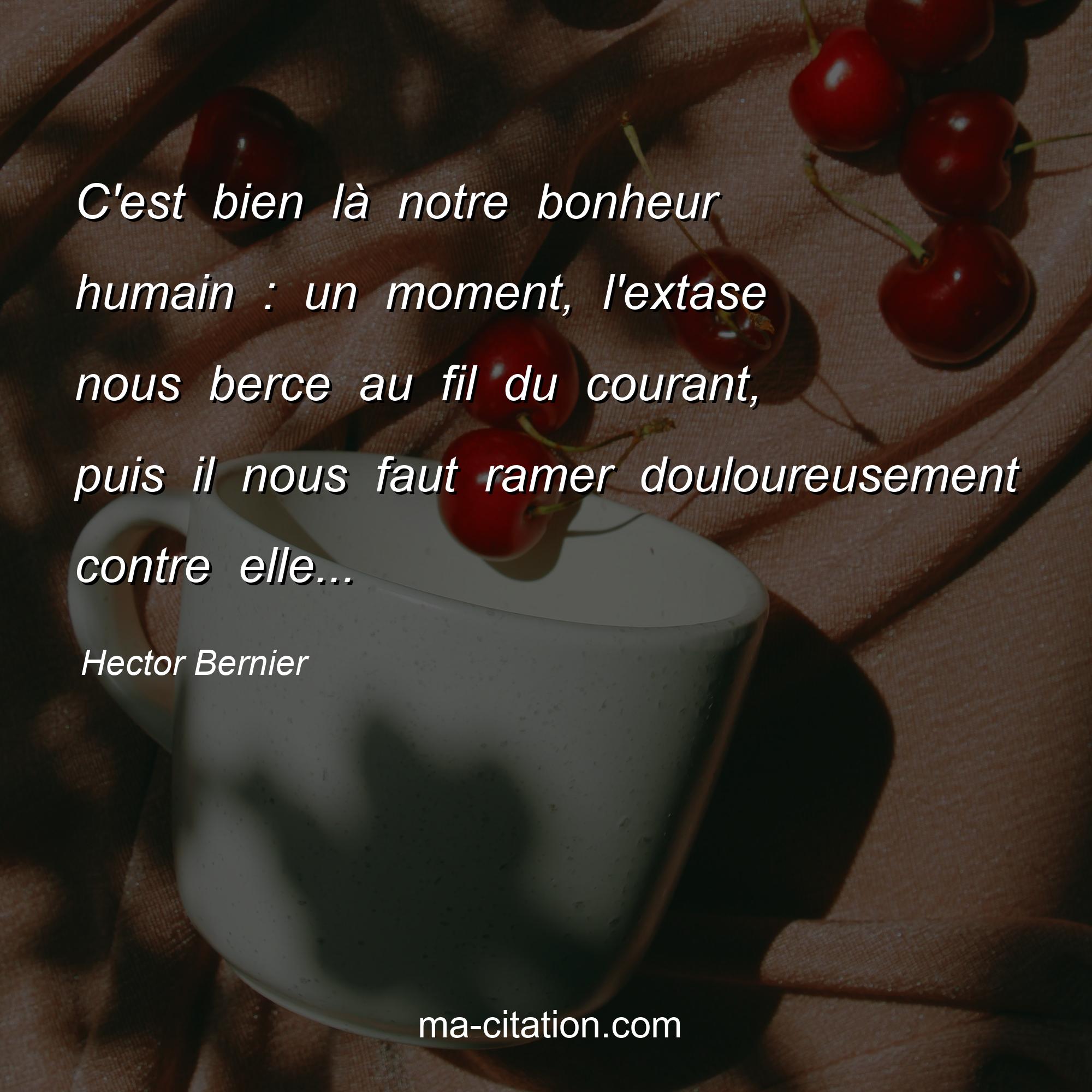 Citation sur la vie de Hector Bernier :C'est bien là notre bonheur humain : un moment, l'extase nous berce au fil du courant, puis il nous faut ramer douloureusement contre elle...