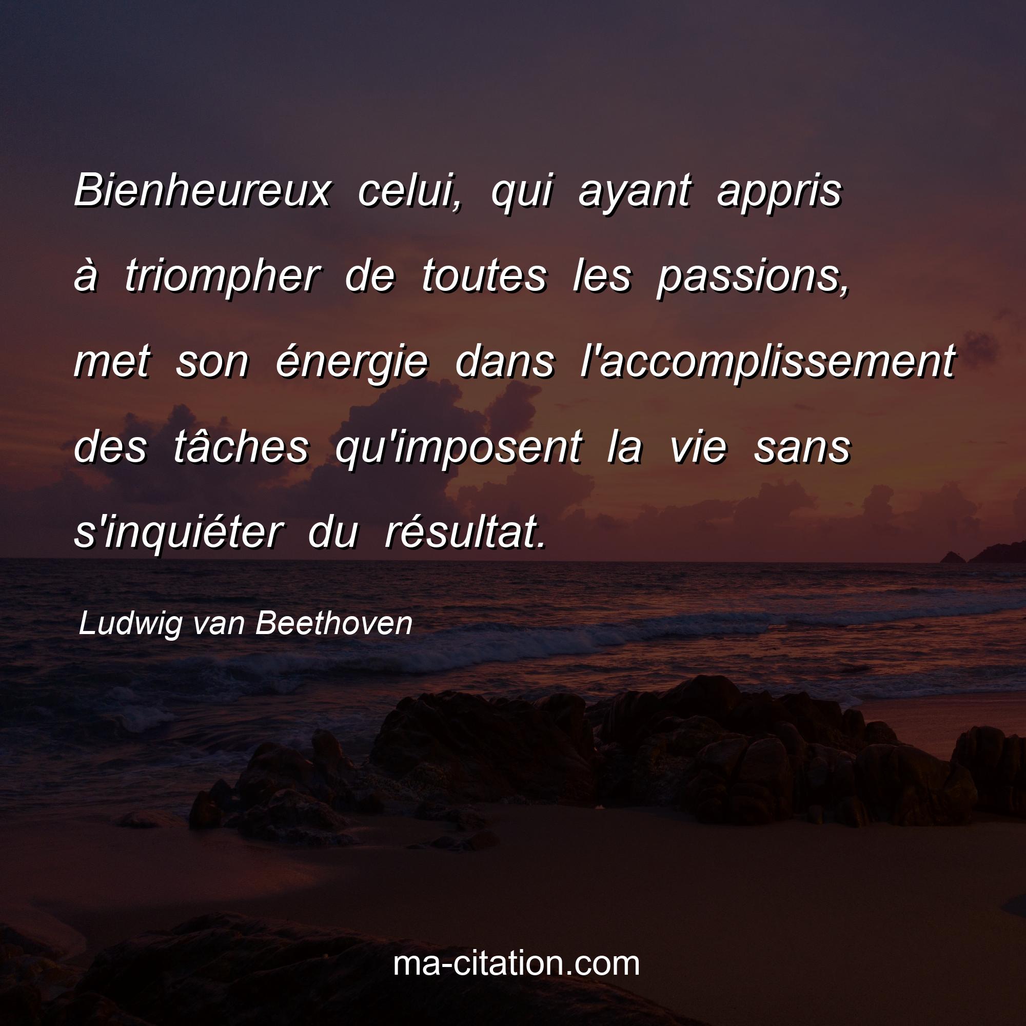 Citation sur la vie de Ludwig van Beethoven :Bienheureux celui, qui ayant appris à triompher de toutes les passions, met son énergie dans l'accomplissement des tâches qu'imposent la vie sans s'inquiéter du résultat.