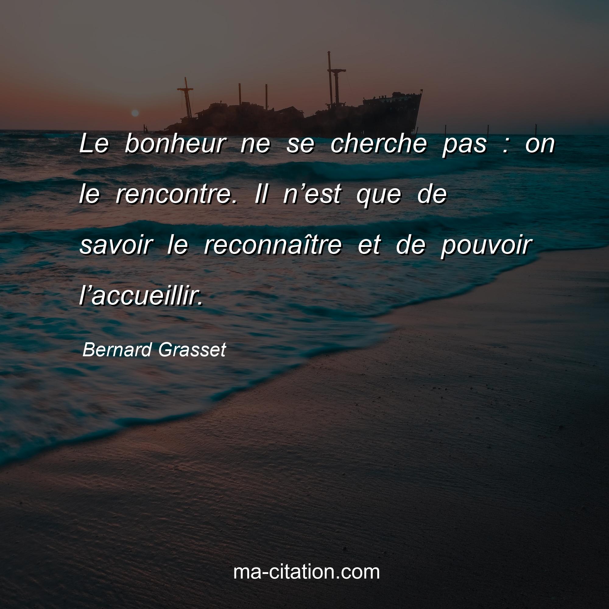 Citation sur la vie de Bernard Grasset :Le bonheur ne se cherche pas : on le rencontre. Il n’est que de savoir le reconnaître et de pouvoir l’accueillir.