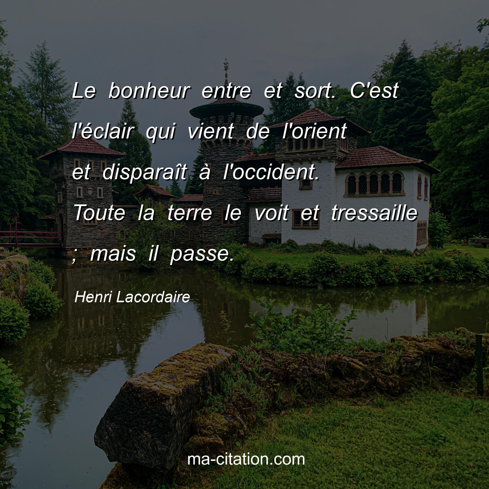 Citation sur la vie de Henri Lacordaire :Le bonheur entre et sort. C'est l'éclair qui vient de l'orient et disparaît à l'occident. Toute la terre le voit et tressaille ; mais il passe.