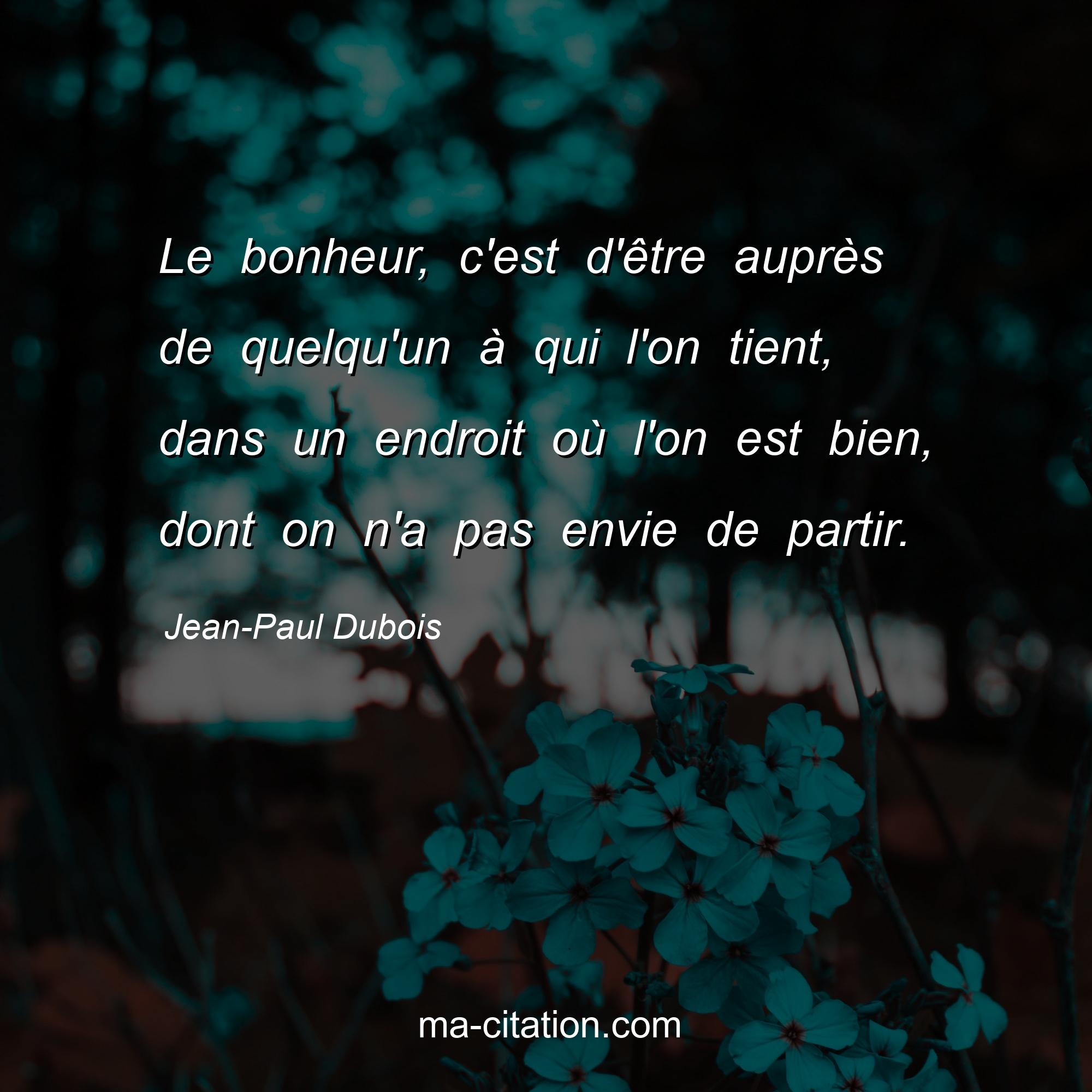 Citation sur la vie de Jean-Paul Dubois :Le bonheur, c'est d'être auprès de quelqu'un à qui l'on tient, dans un endroit où l'on est bien, dont on n'a pas envie de partir.