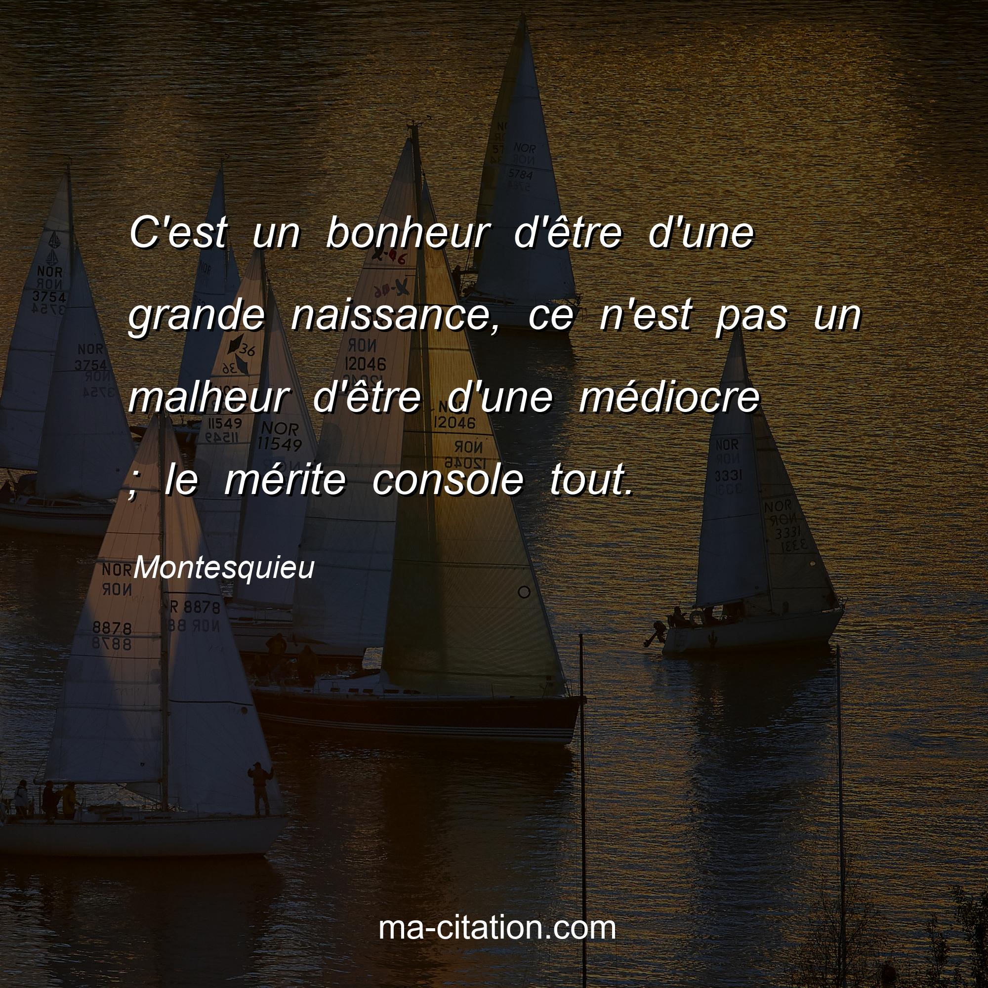 Citation sur la vie de Montesquieu :C'est un bonheur d'être d'une grande naissance, ce n'est pas un malheur d'être d'une médiocre ; le mérite console tout.