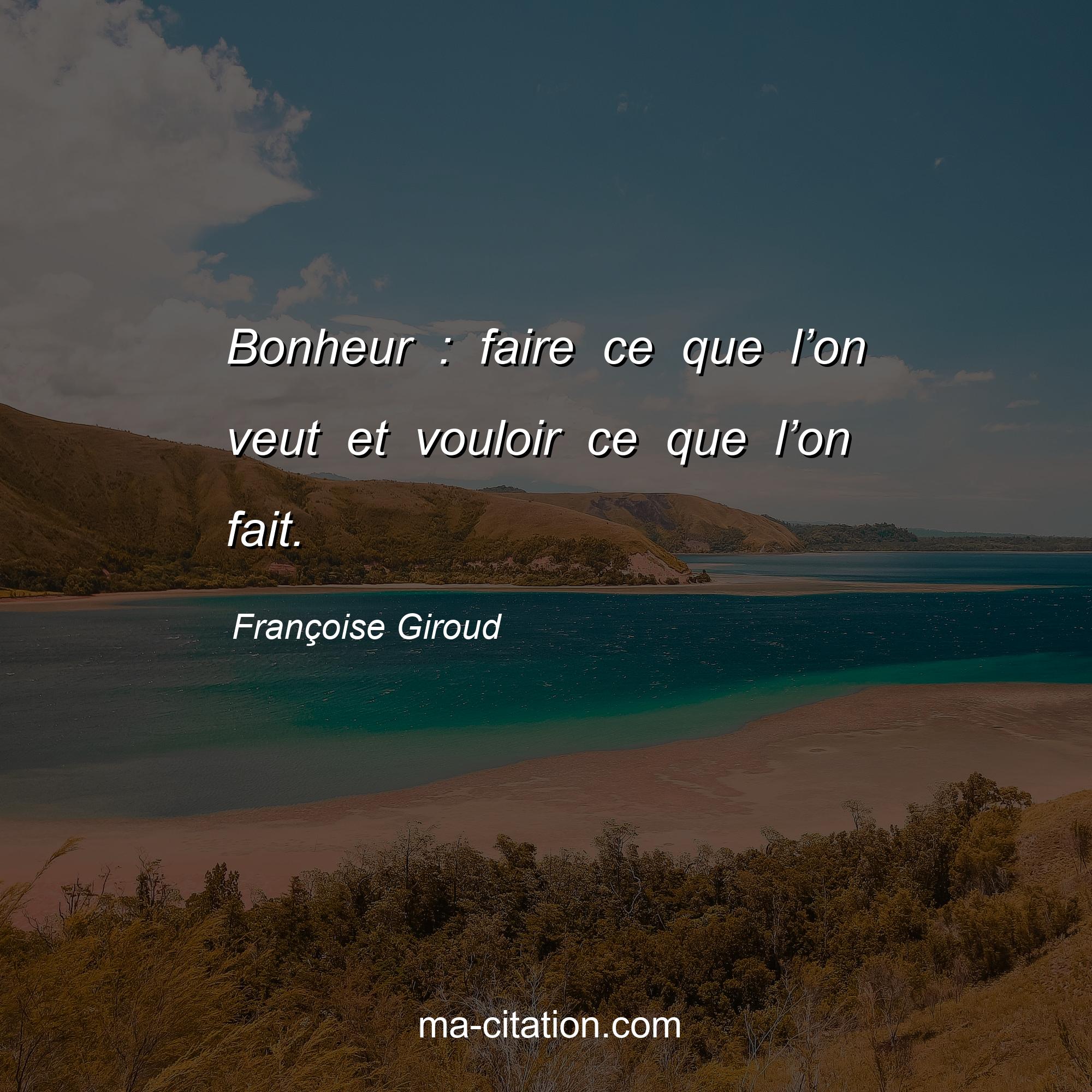 Françoise Giroud est l'auteur de la citation sur la vie "Bonheur : faire ce que l’on veut et vouloir ce que l’on fait.".