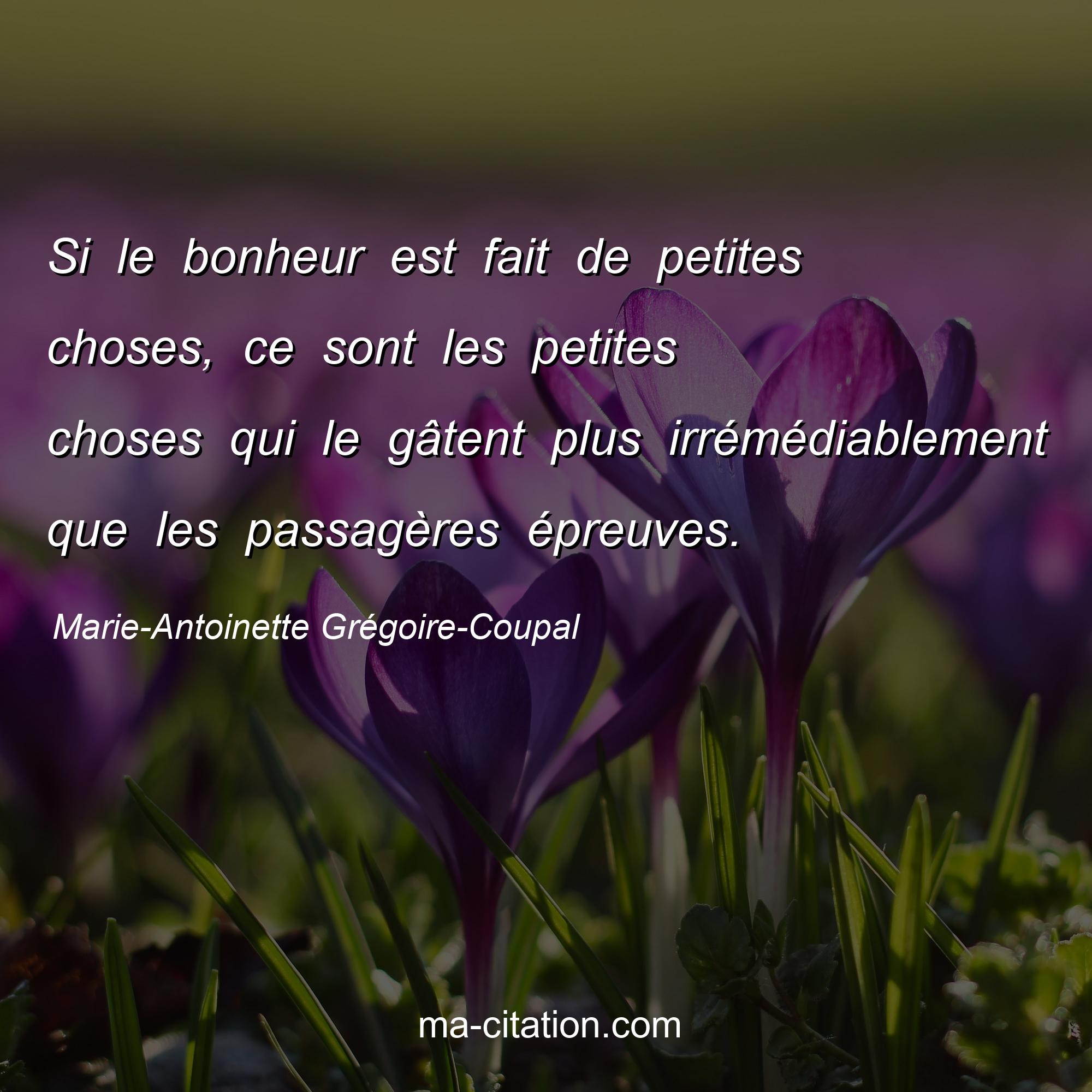 Marie-Antoinette Grégoire-Coupal est l'auteur de la citation sur la vie "Si le bonheur est fait de petites choses, ce sont les petites choses qui le gâtent plus irrémédiablement que les passagères épreuves.".