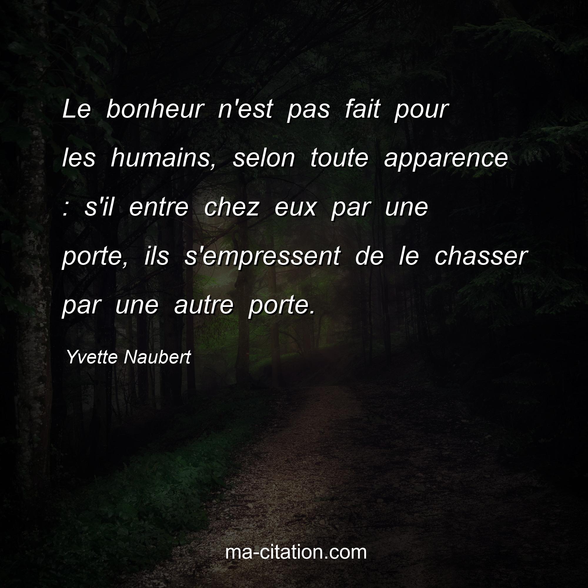 Yvette Naubert est l'auteur de la citation sur la vie "Le bonheur n'est pas fait pour les humains, selon toute apparence : s'il entre chez eux par une porte, ils s'empressent de le chasser par une autre porte.".