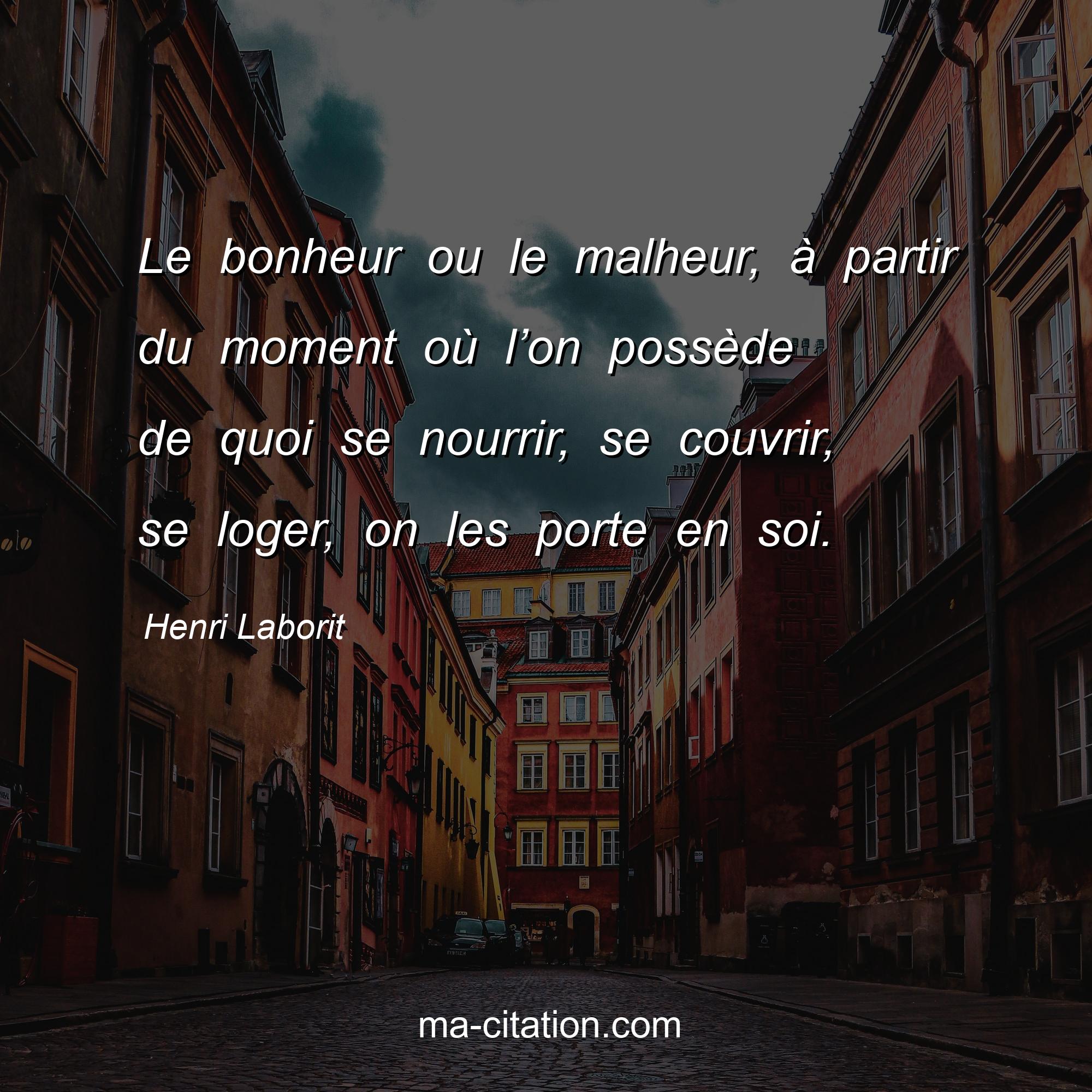 Citation sur la vie de Henri Laborit :Le bonheur ou le malheur, à partir du moment où l’on possède de quoi se nourrir, se couvrir, se loger, on les porte en soi.