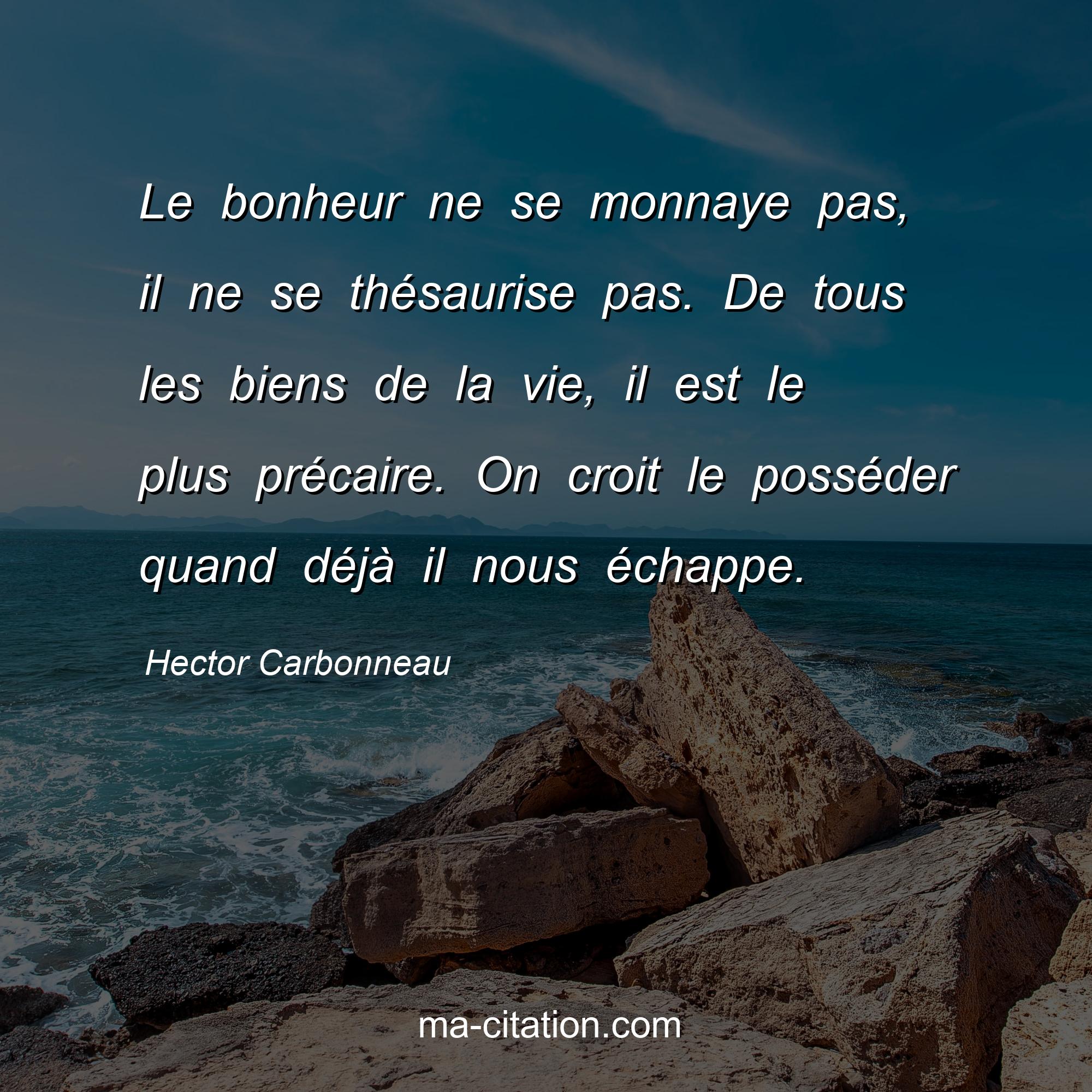 Citation sur la vie de Hector Carbonneau :Le bonheur ne se monnaye pas, il ne se thésaurise pas. De tous les biens de la vie, il est le plus précaire. On croit le posséder quand déjà il nous échappe.