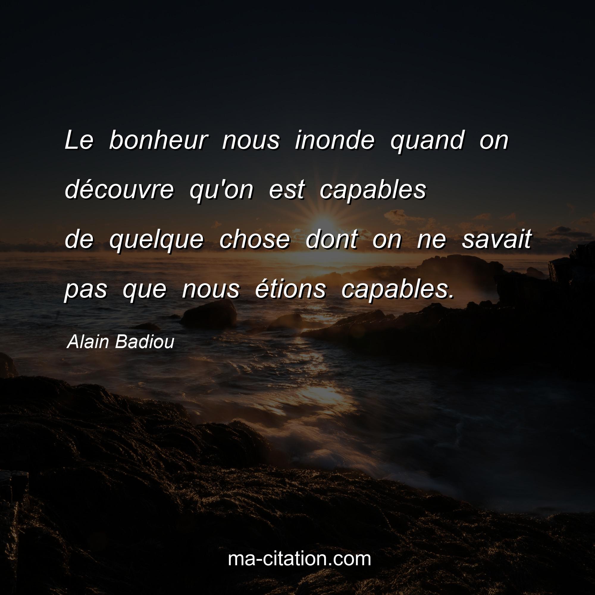 Citation sur la vie d'Alain Badiou :Le bonheur nous inonde quand on découvre qu'on est capables de quelque chose dont on ne savait pas que nous étions capables.