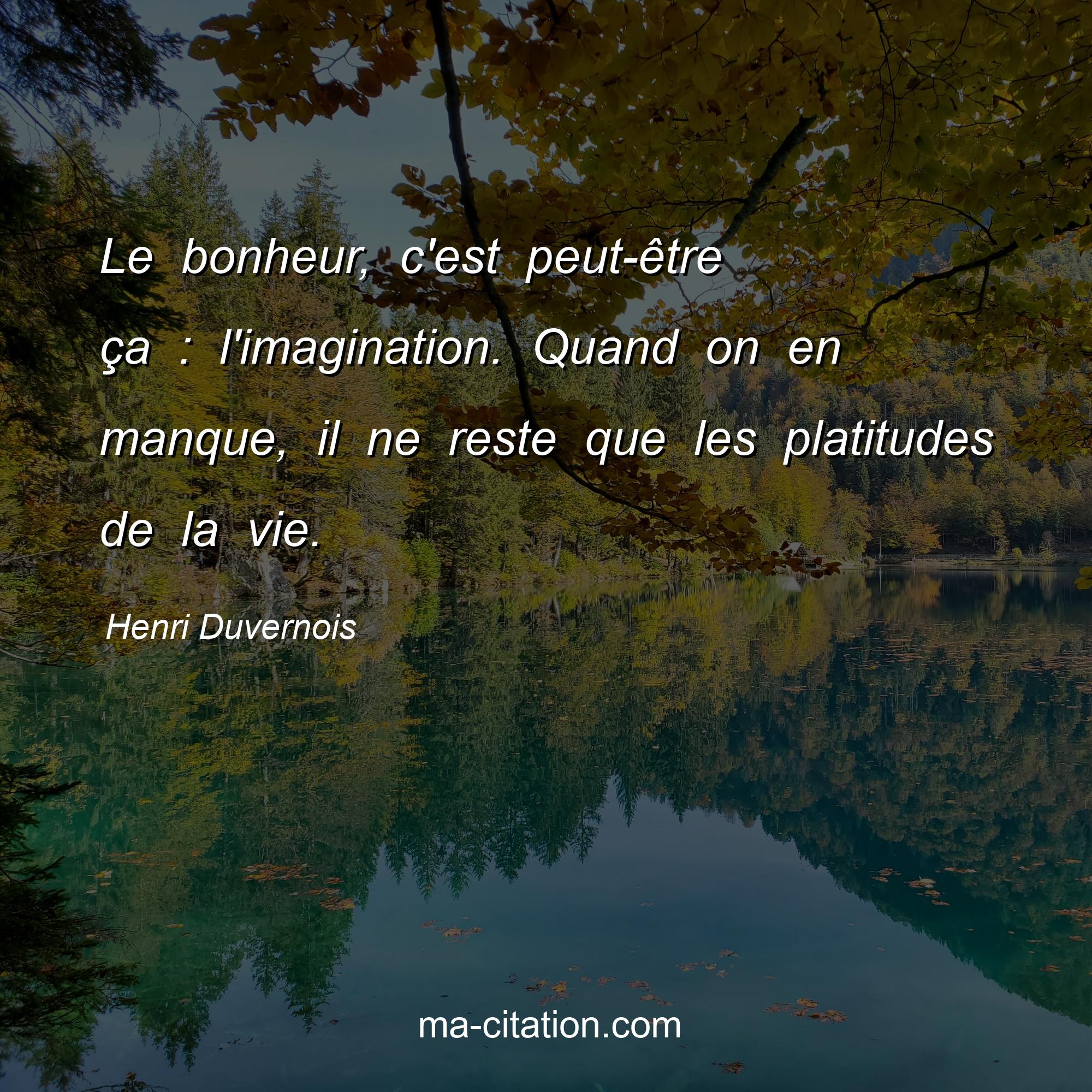 Citation sur la vie de Henri Duvernois :Le bonheur, c'est peut-être ça : l'imagination. Quand on en manque, il ne reste que les platitudes de la vie.