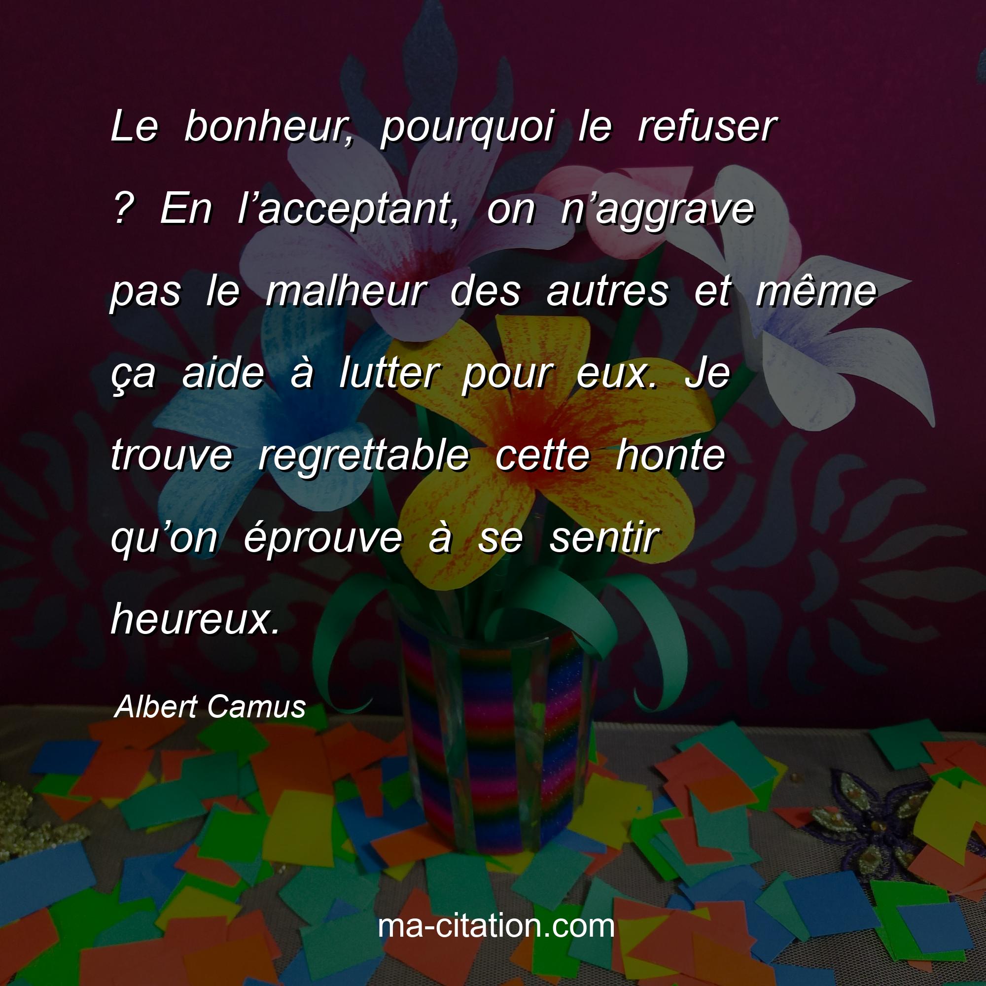 Citation sur la vie d'Albert Camus :Le bonheur, pourquoi le refuser ? En l’acceptant, on n’aggrave pas le malheur des autres et même ça aide à lutter pour eux. Je trouve regrettable cette honte qu’on éprouve à se sentir heureux.