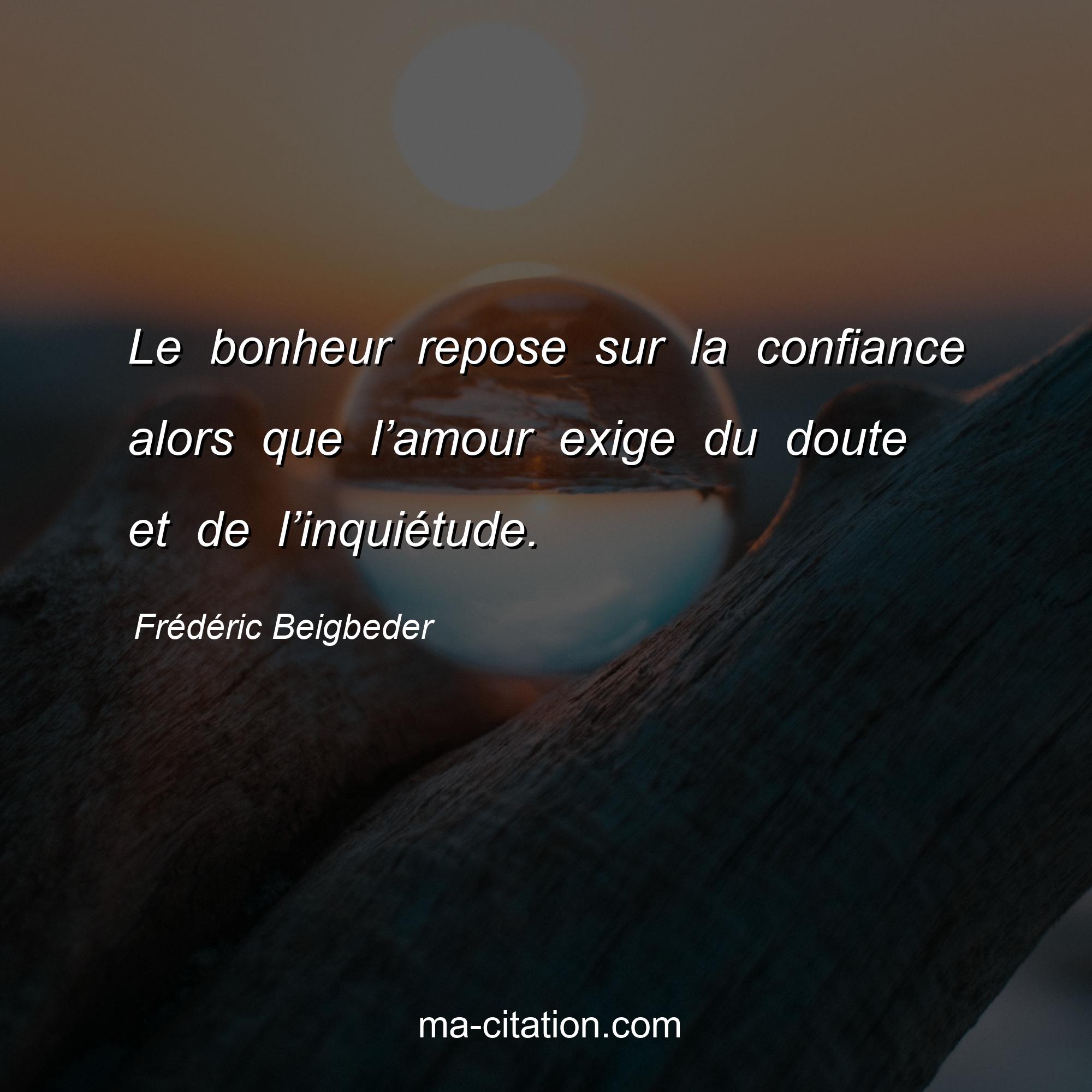 Citation sur la vie de Frédéric Beigbeder :Le bonheur repose sur la confiance alors que l’amour exige du doute et de l’inquiétude.