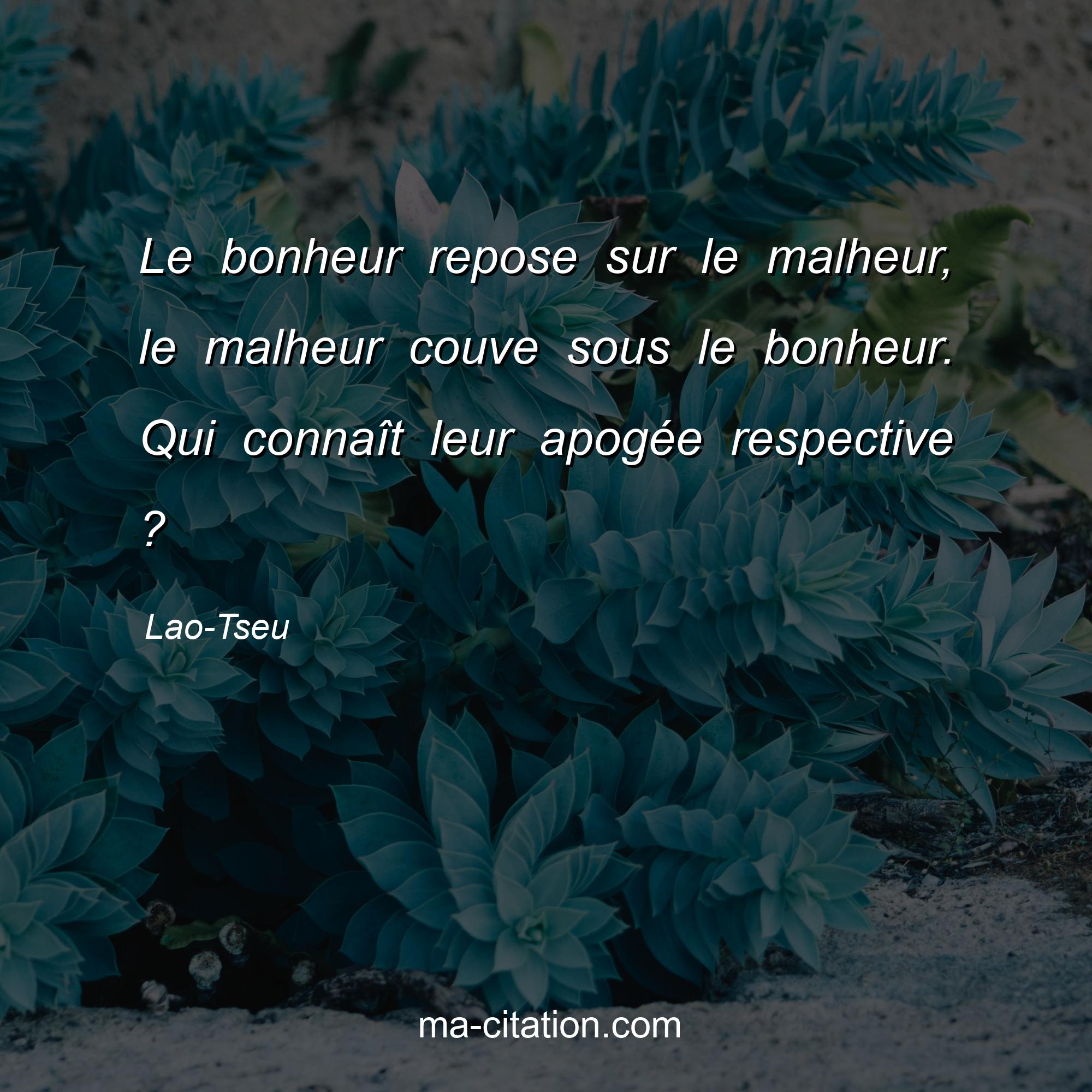 Citation sur la vie de Lao-Tseu :Le bonheur repose sur le malheur, le malheur couve sous le bonheur. Qui connaît leur apogée respective ?