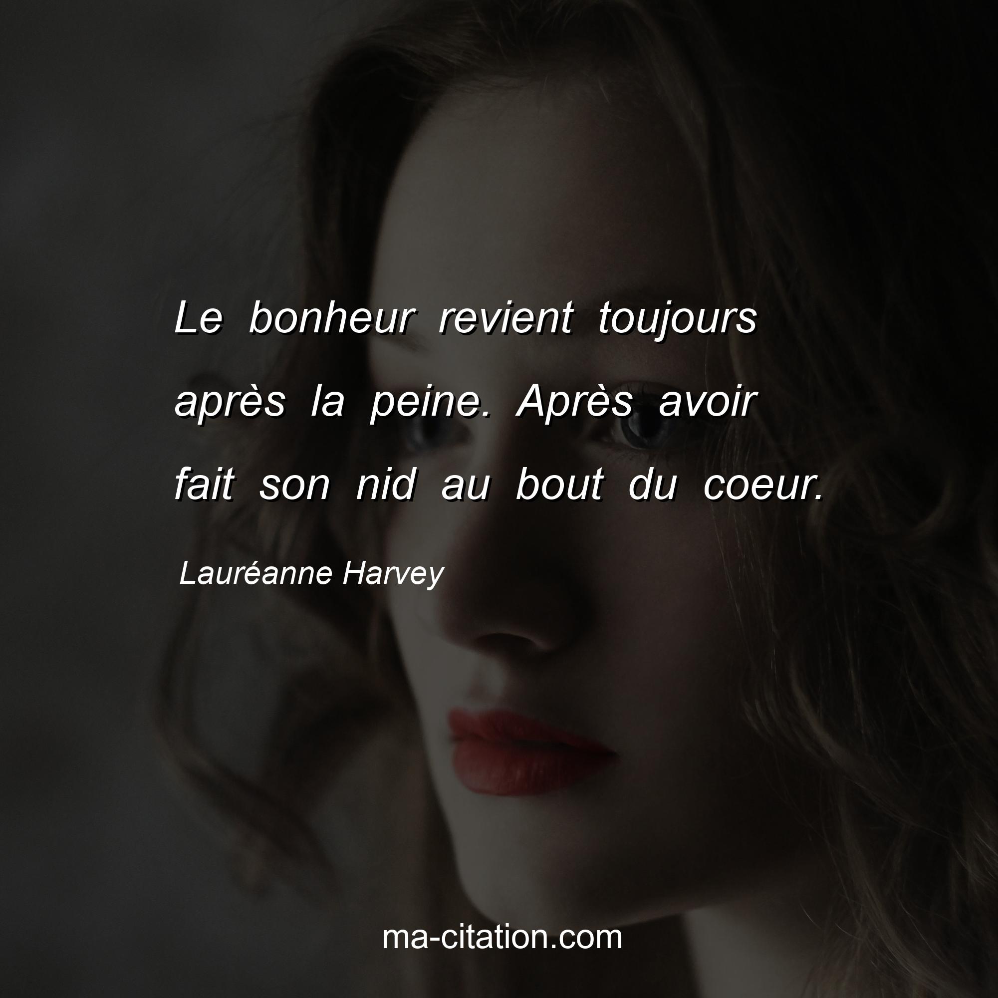 Lauréanne Harvey est l'auteur de la citation sur la vie "Le bonheur revient toujours après la peine. Après avoir fait son nid au bout du coeur.".