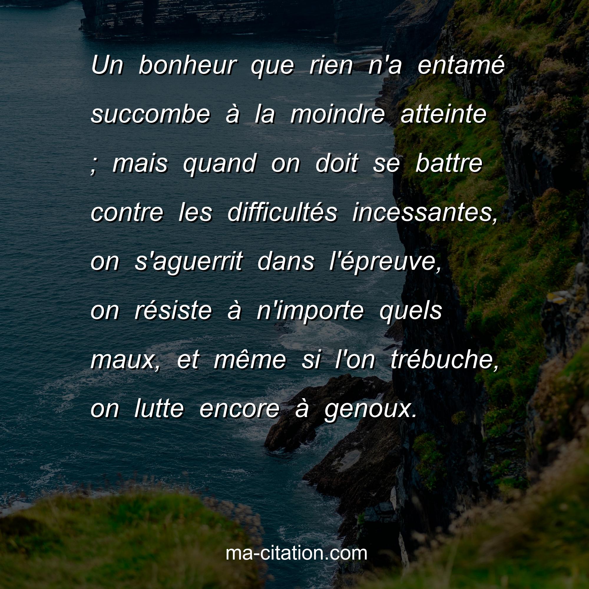 Un bonheur que rien n'a entamé succombe à la moindre atteinte ; mais quand on doit se battre contre les difficultés incessantes, on s'aguerrit dans l'épreuve, on résiste à n'importe quels maux, et même si l'on trébuche, on lutte encore à genoux.