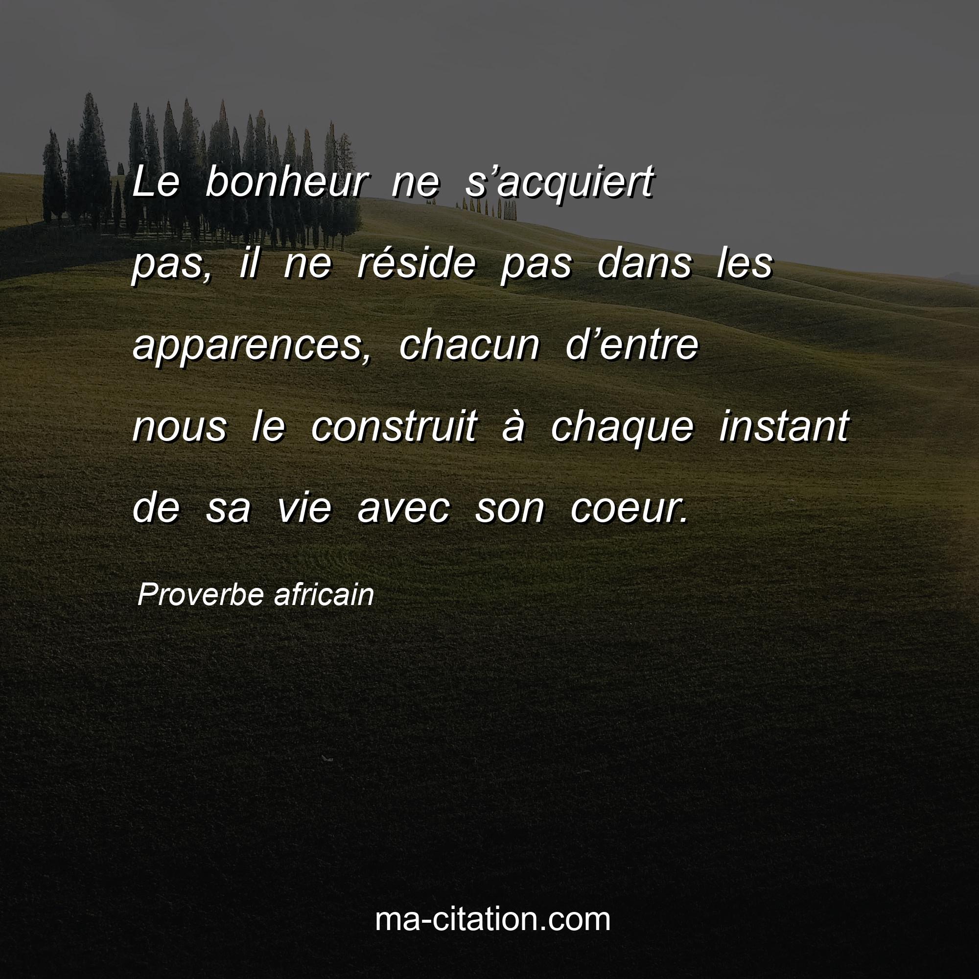 Proverbe africain sur la vie :Le bonheur ne s’acquiert pas, il ne réside pas dans les apparences, chacun d’entre nous le construit à chaque instant de sa vie avec son coeur.