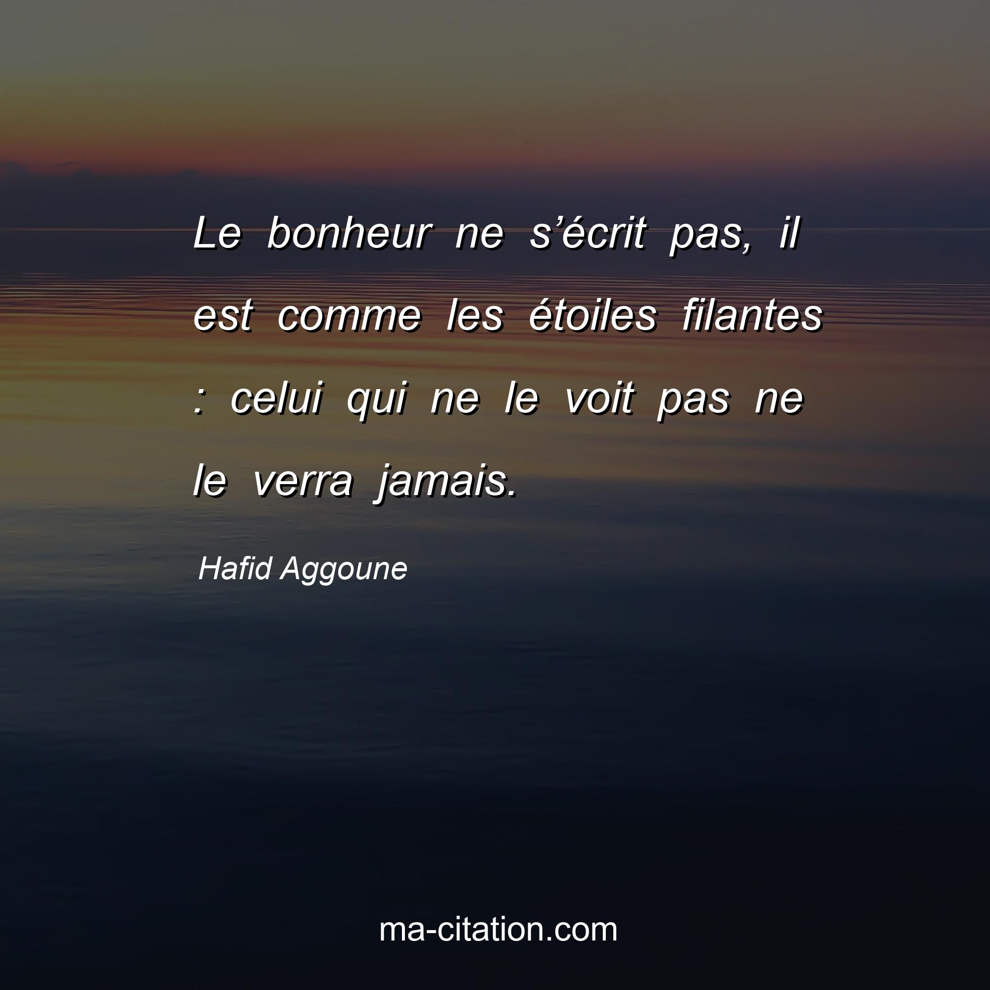 Hafid Aggoune est l'auteur de la citation sur la vie "Le bonheur ne s’écrit pas, il est comme les étoiles filantes : celui qui ne le voit pas ne le verra jamais.".