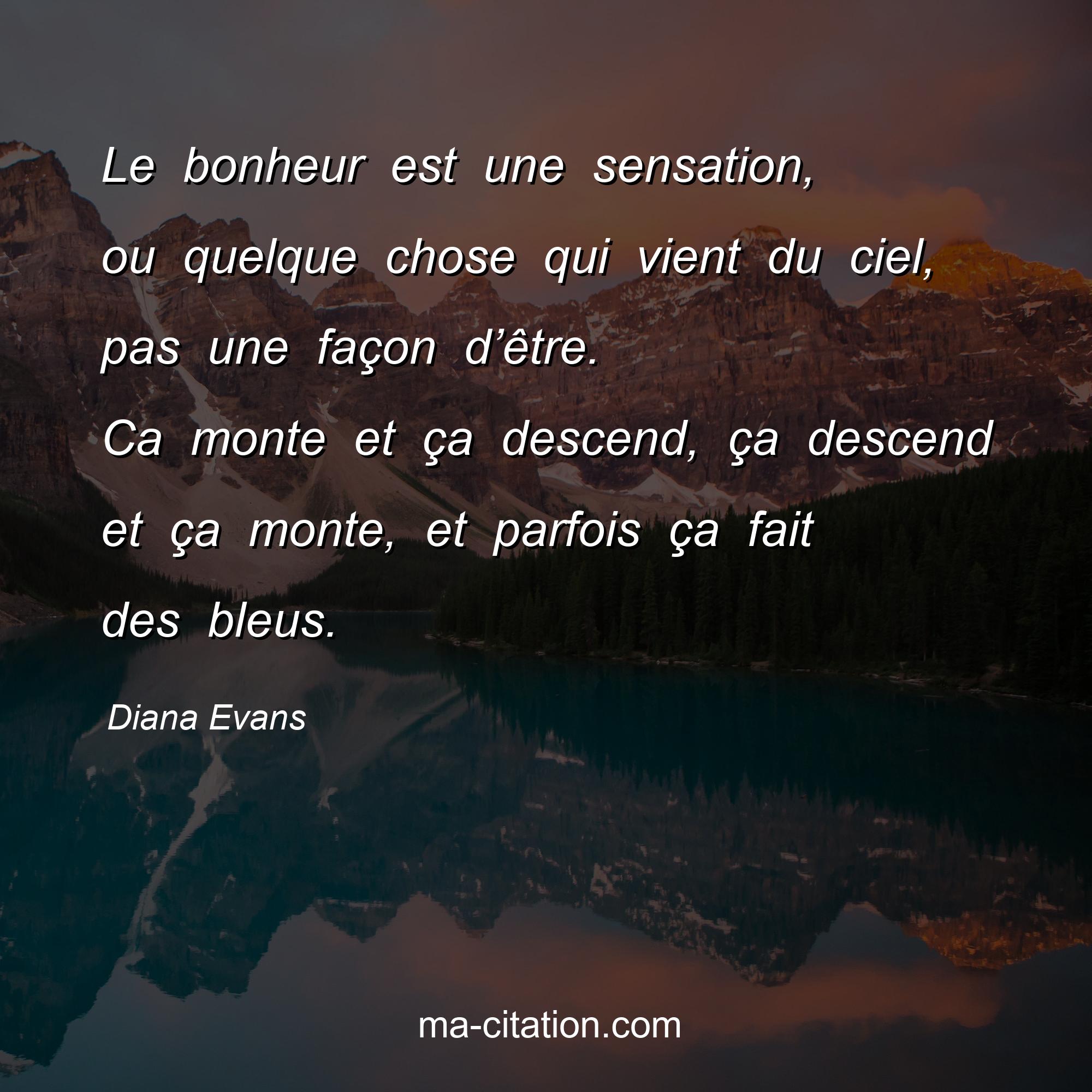Citation sur la vie de Diana Evans :Le bonheur est une sensation, ou quelque chose qui vient du ciel, pas une façon d’être. Ca monte et ça descend, ça descend et ça monte, et parfois ça fait des bleus.