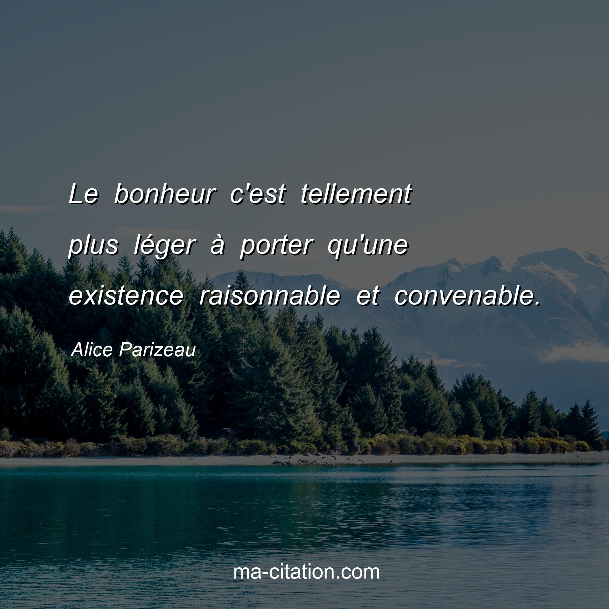 Alice Parizeau est l'auteur de la citation sur la vie "Le bonheur c'est tellement plus léger à porter qu'une existence raisonnable et convenable.".