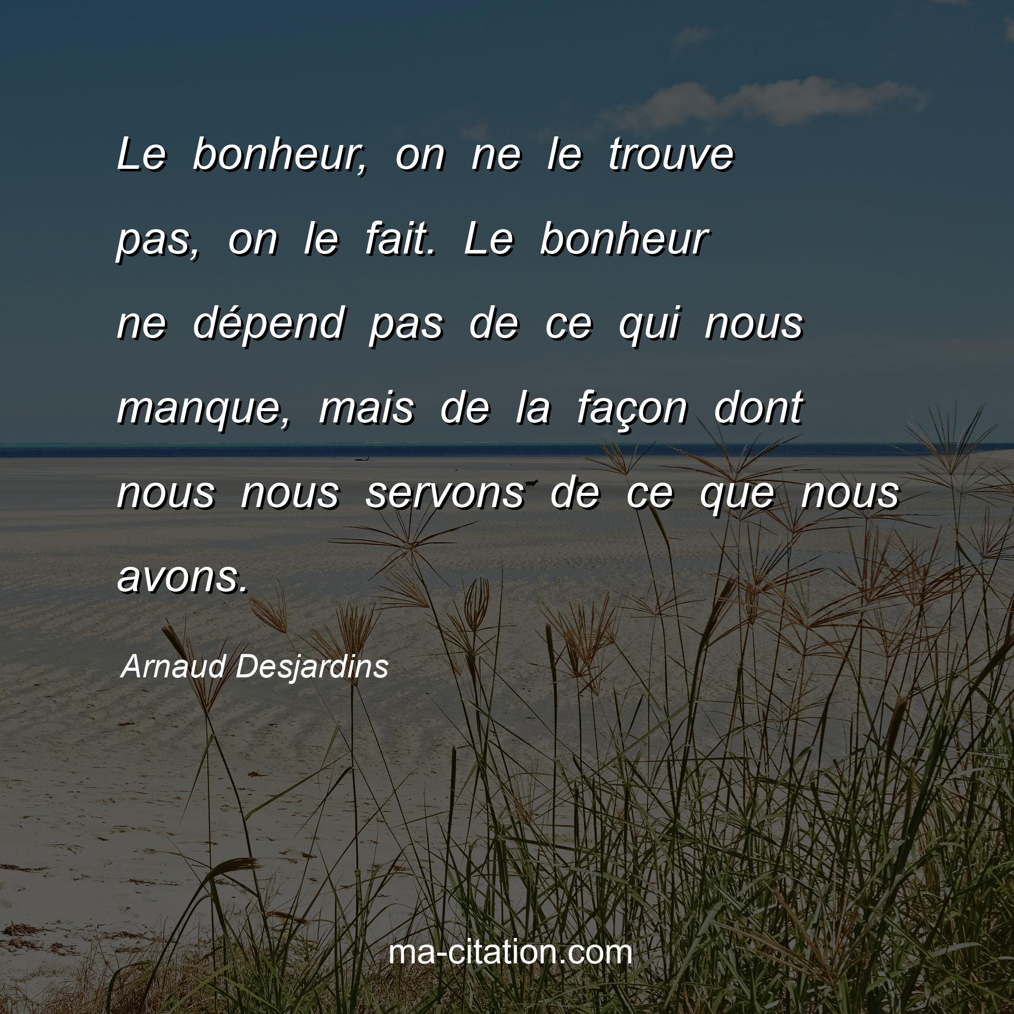 Citation sur la vie d'Arnaud Desjardins :Le bonheur, on ne le trouve pas, on le fait. Le bonheur ne dépend pas de ce qui nous manque, mais de la façon dont nous nous servons de ce que nous avons.