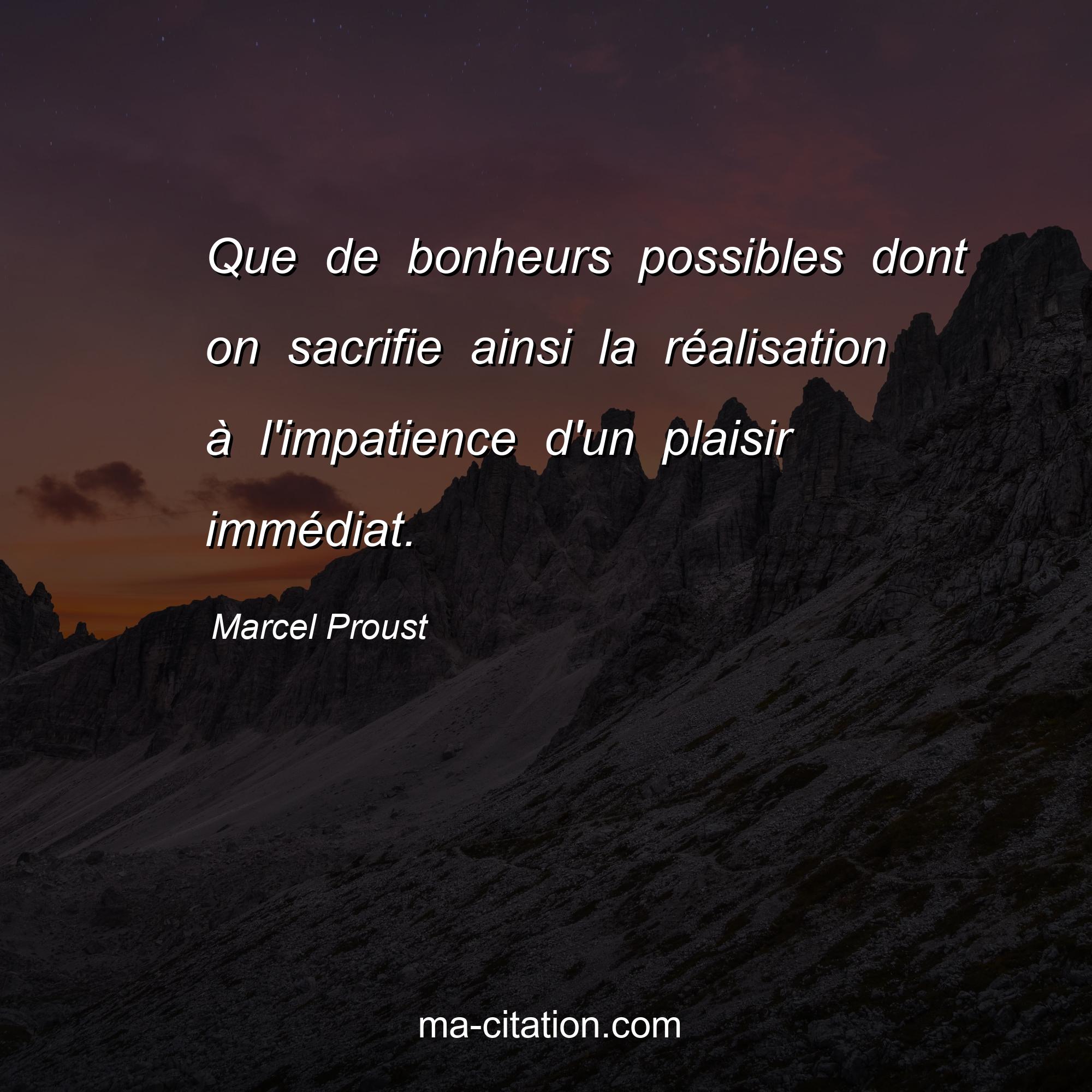 Citation sur la vie de Marcel Proust :Que de bonheurs possibles dont on sacrifie ainsi la réalisation à l'impatience d'un plaisir immédiat.