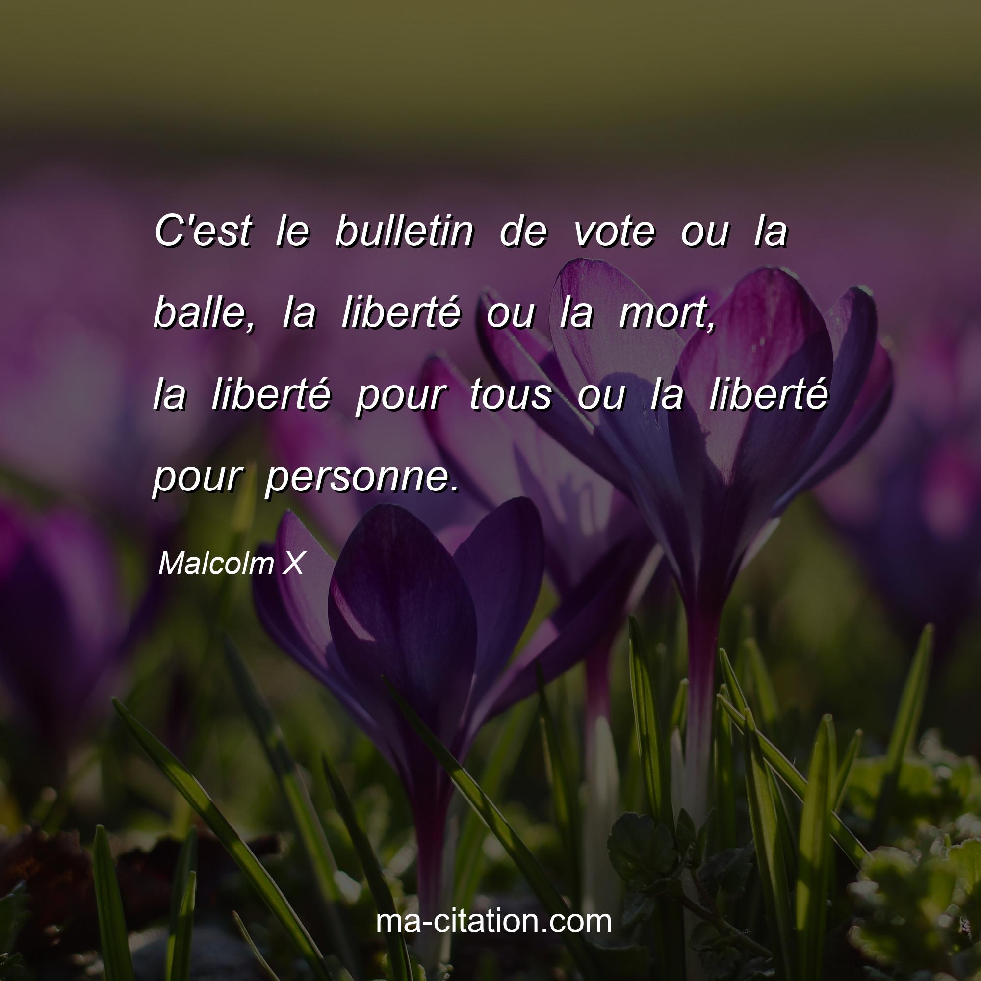 Citation sur la vie de Malcolm X :C'est le bulletin de vote ou la balle, la liberté ou la mort, la liberté pour tous ou la liberté pour personne.