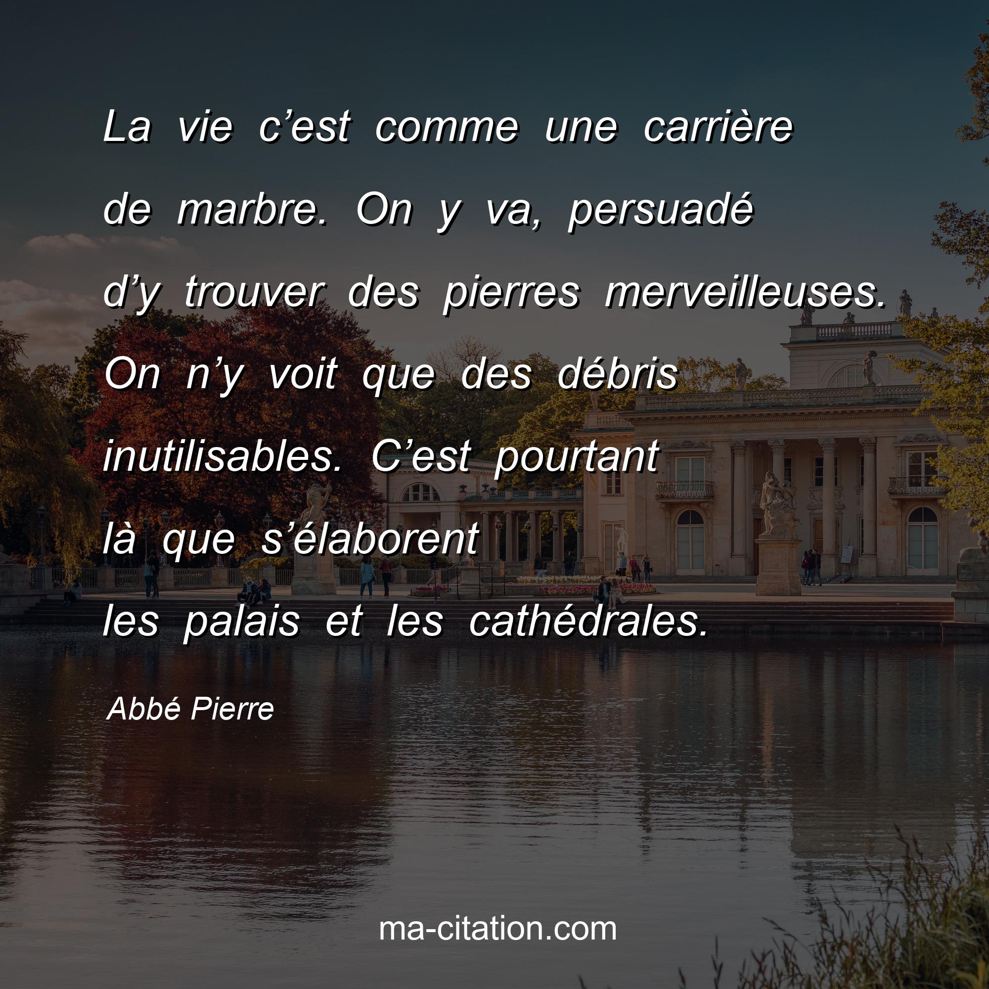 Abbé Pierre est l'auteur de la citation sur la vie "La vie c’est comme une carrière de marbre. On y va, persuadé d’y trouver des pierres merveilleuses. On n’y voit que des débris inutilisables. C’est pourtant là que s’élaborent les palais et les cathédrales.".