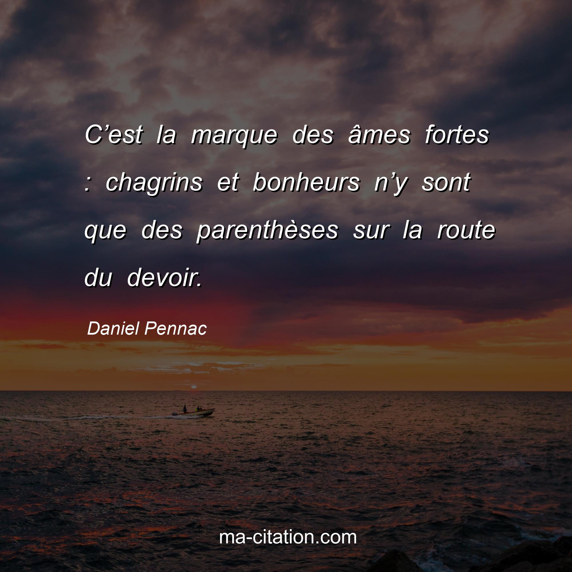 Citation sur la vie de Daniel Pennac :C’est la marque des âmes fortes : chagrins et bonheurs n’y sont que des parenthèses sur la route du devoir.