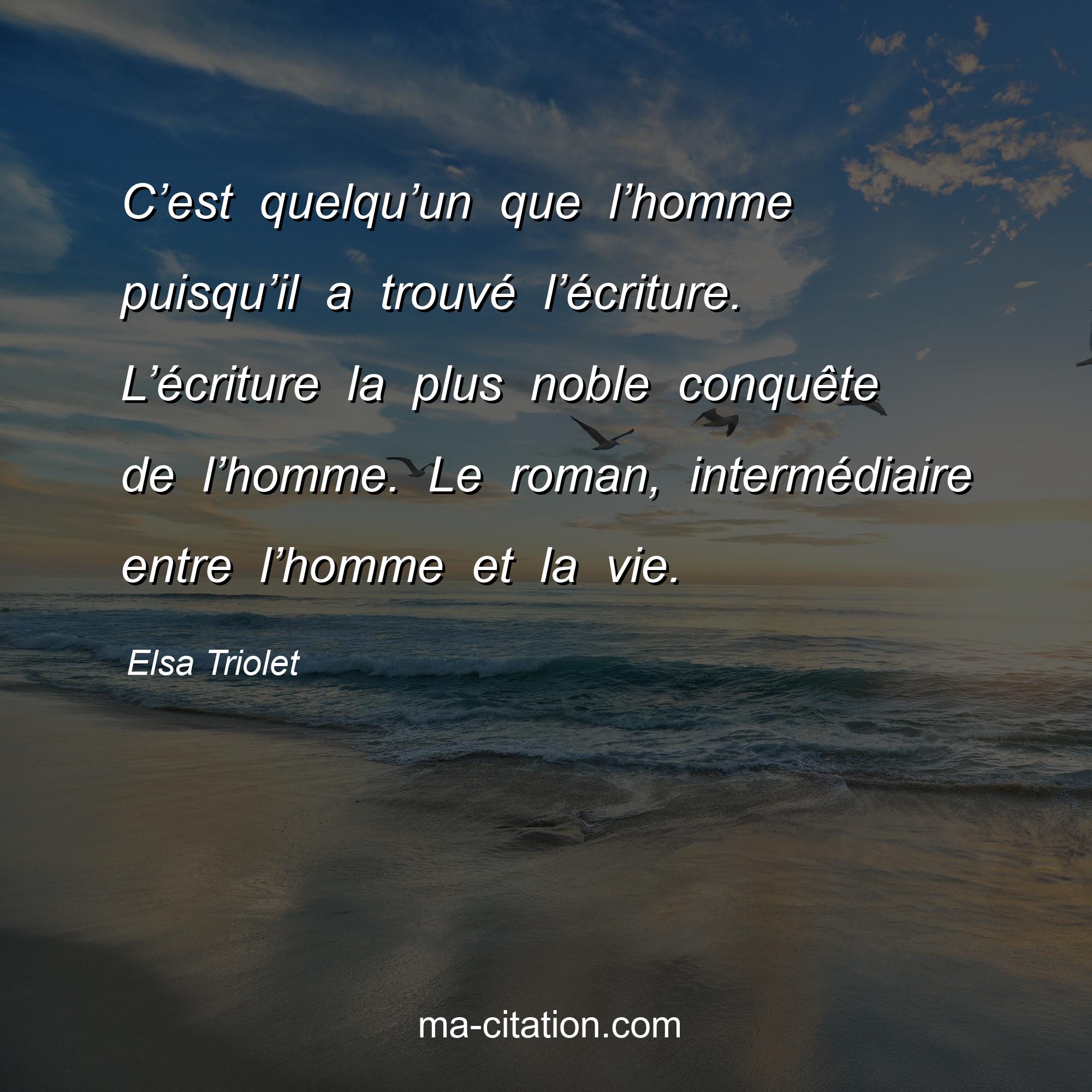 Citation sur la vie d'Elsa Triolet :C’est quelqu’un que l’homme puisqu’il a trouvé l’écriture. L’écriture la plus noble conquête de l’homme. Le roman, intermédiaire entre l’homme et la vie.