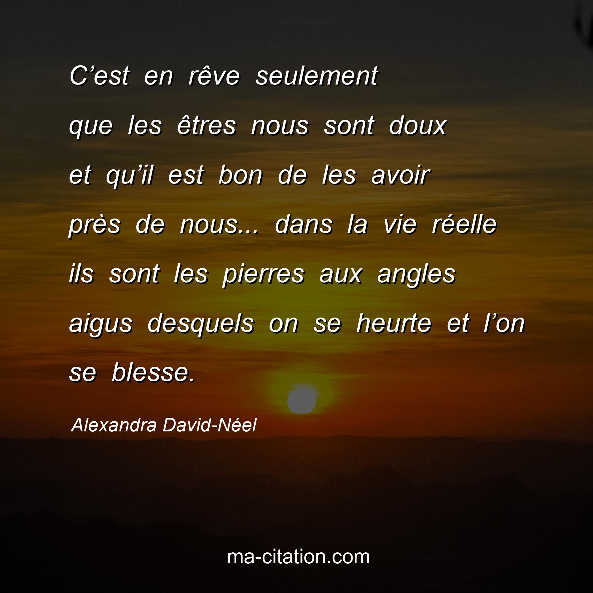 Citation sur la vie d'Alexandra David-Néel :C’est en rêve seulement que les êtres nous sont doux et qu’il est bon de les avoir près de nous... dans la vie réelle ils sont les pierres aux angles aigus desquels on se heurte et l’on se blesse.