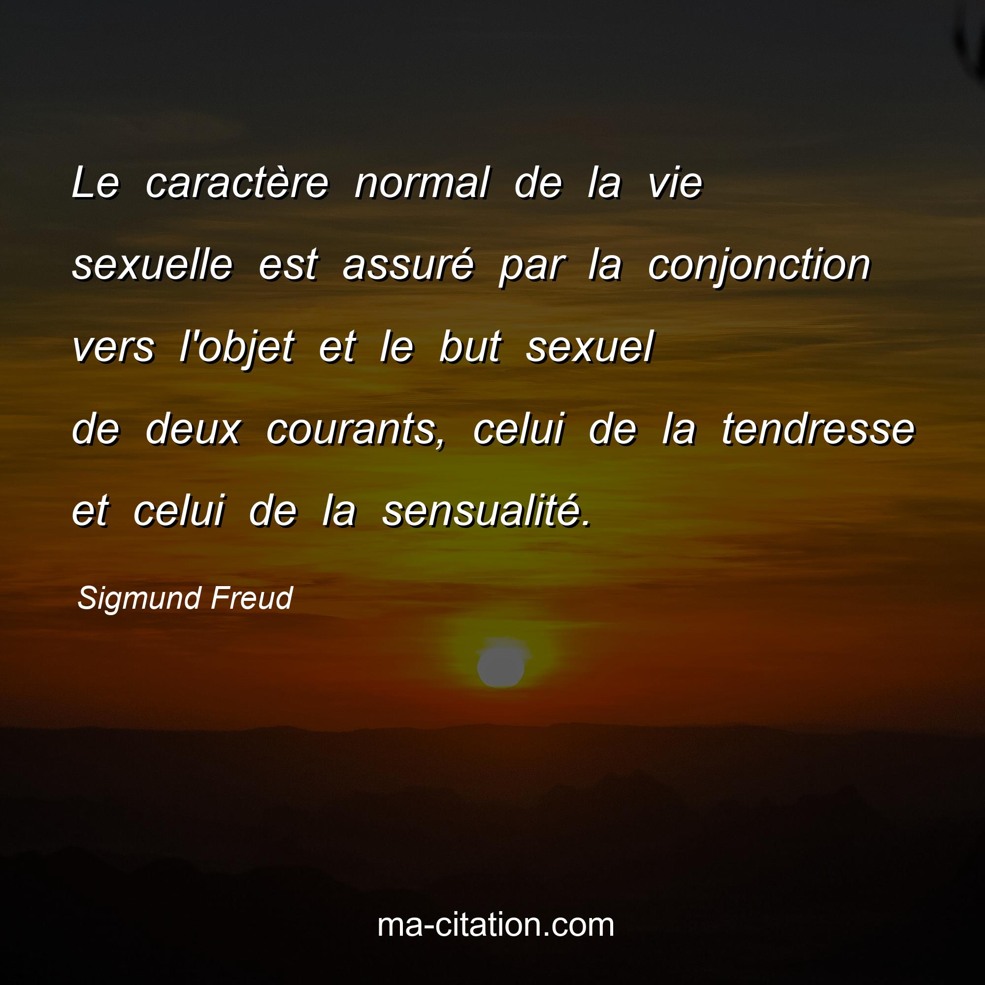 Citation sur la vie de Sigmund Freud :Le caractère normal de la vie sexuelle est assuré par la conjonction vers l'objet et le but sexuel de deux courants, celui de la tendresse et celui de la sensualité.
