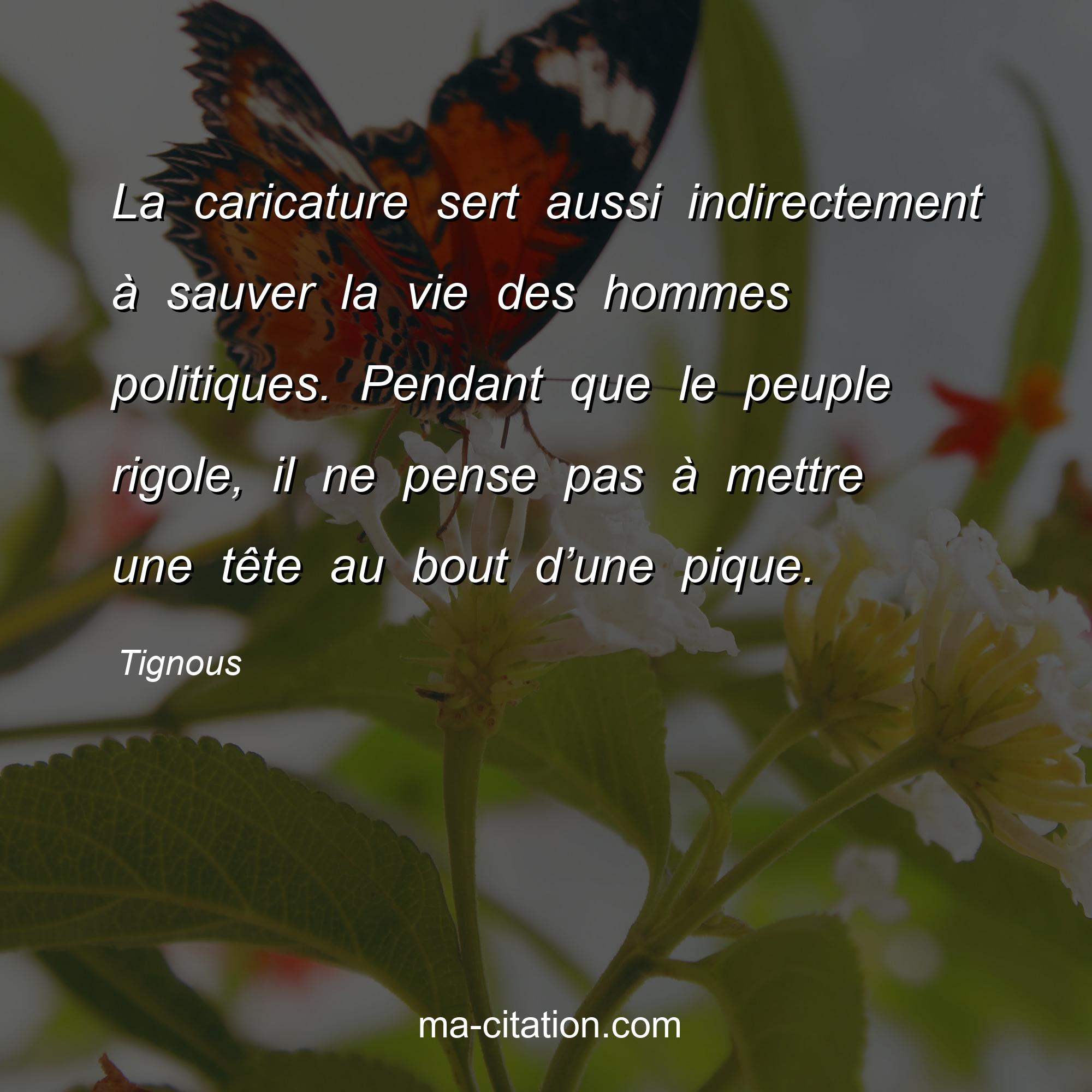Citation sur la vie de Tignous :La caricature sert aussi indirectement à sauver la vie des hommes politiques. Pendant que le peuple rigole, il ne pense pas à mettre une tête au bout d’une pique.