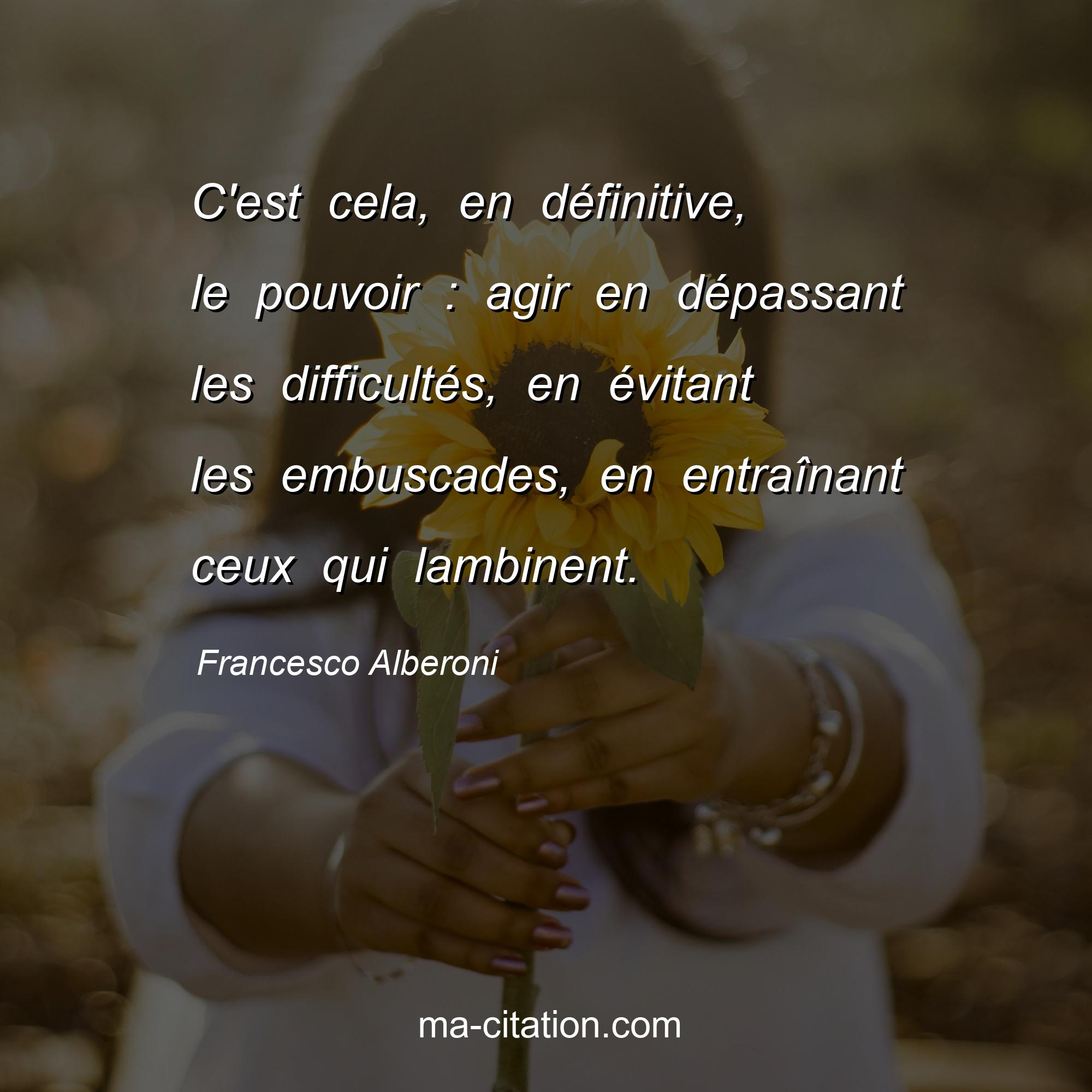 Citation sur la vie de Francesco Alberoni :C'est cela, en définitive, le pouvoir : agir en dépassant les difficultés, en évitant les embuscades, en entraînant ceux qui lambinent.