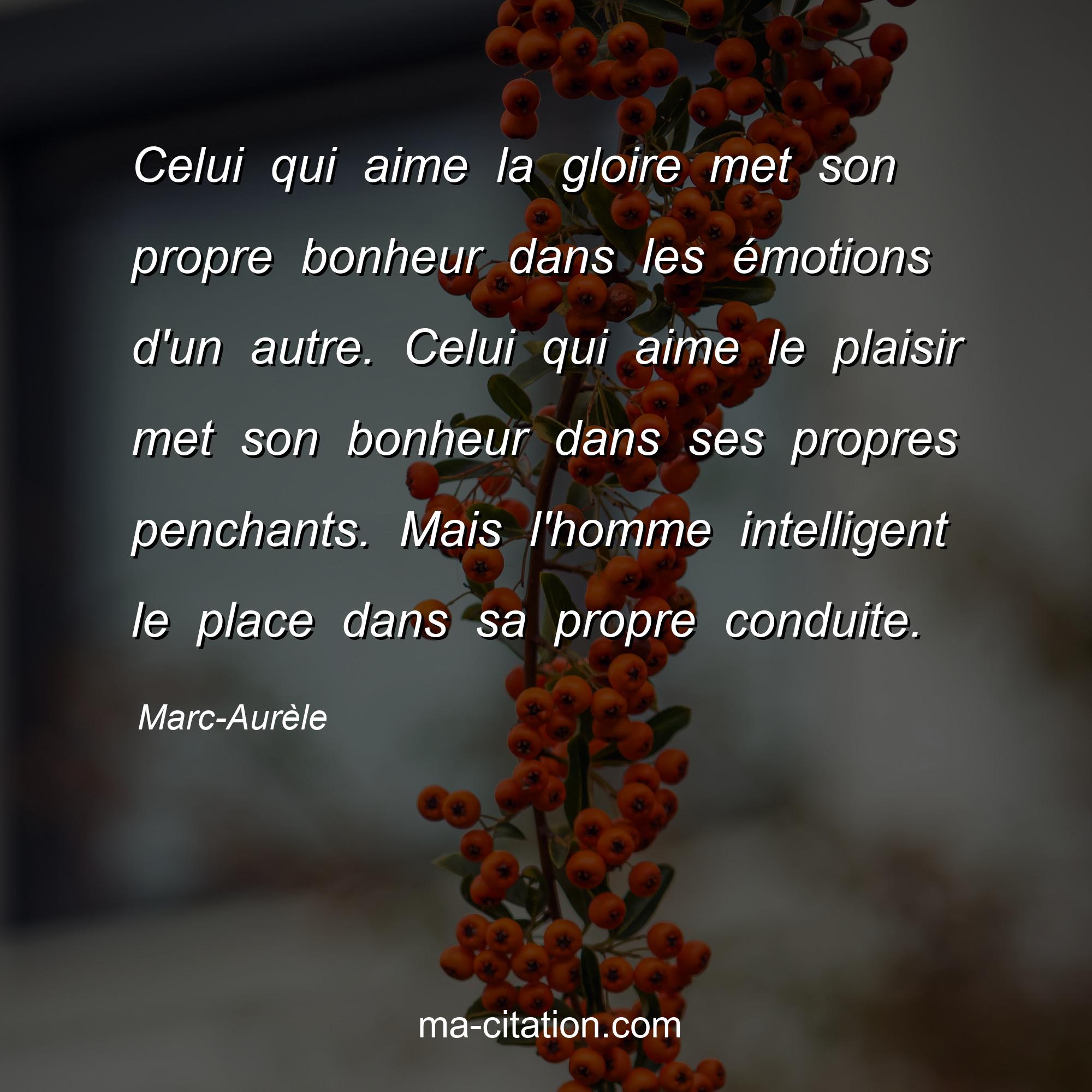 Citation sur la vie de Marc-Aurèle :Celui qui aime la gloire met son propre bonheur dans les émotions d'un autre. Celui qui aime le plaisir met son bonheur dans ses propres penchants. Mais l'homme intelligent le place dans sa propre conduite.