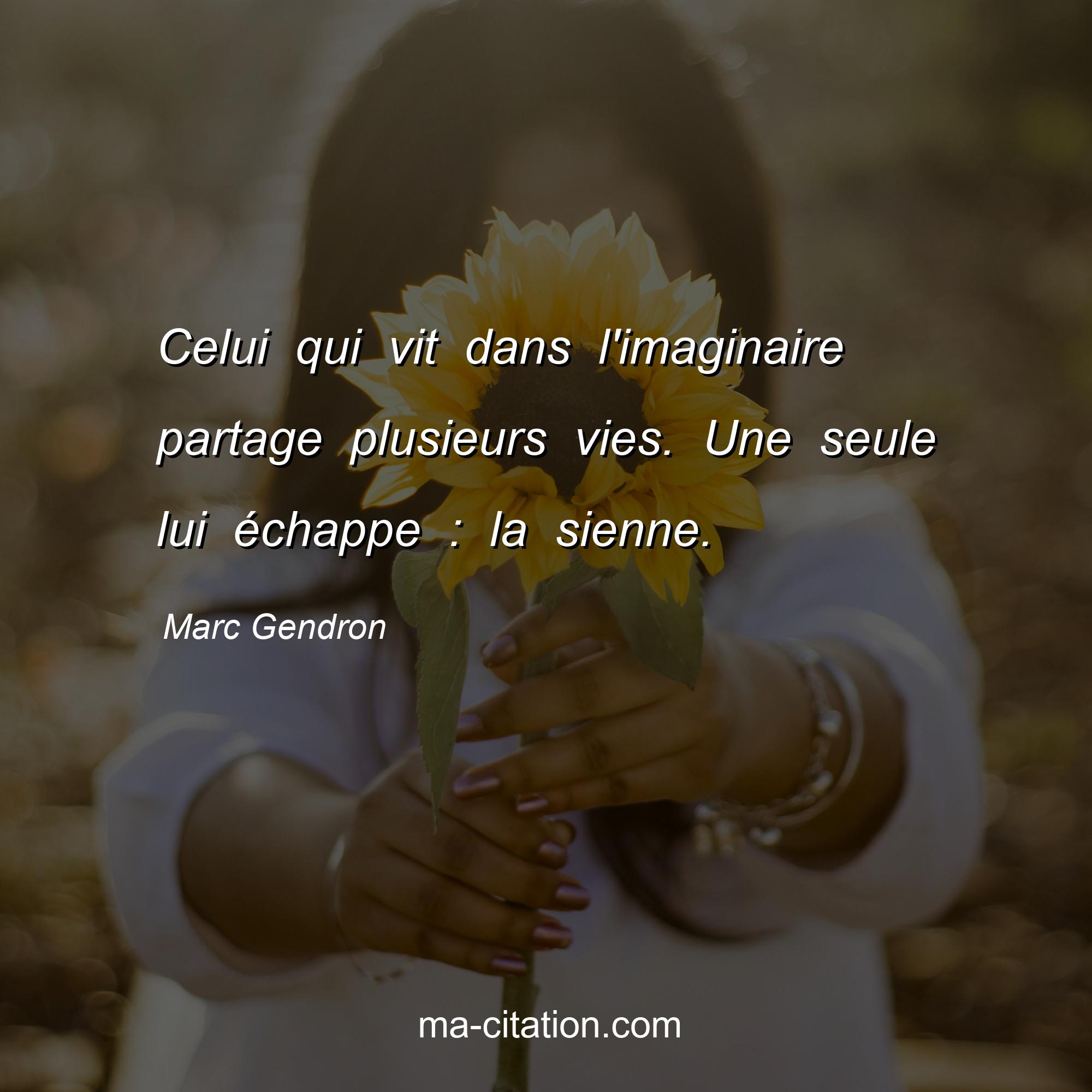 Marc Gendron est l'auteur de la citation sur la vie "Celui qui vit dans l'imaginaire partage plusieurs vies. Une seule lui échappe : la sienne.".