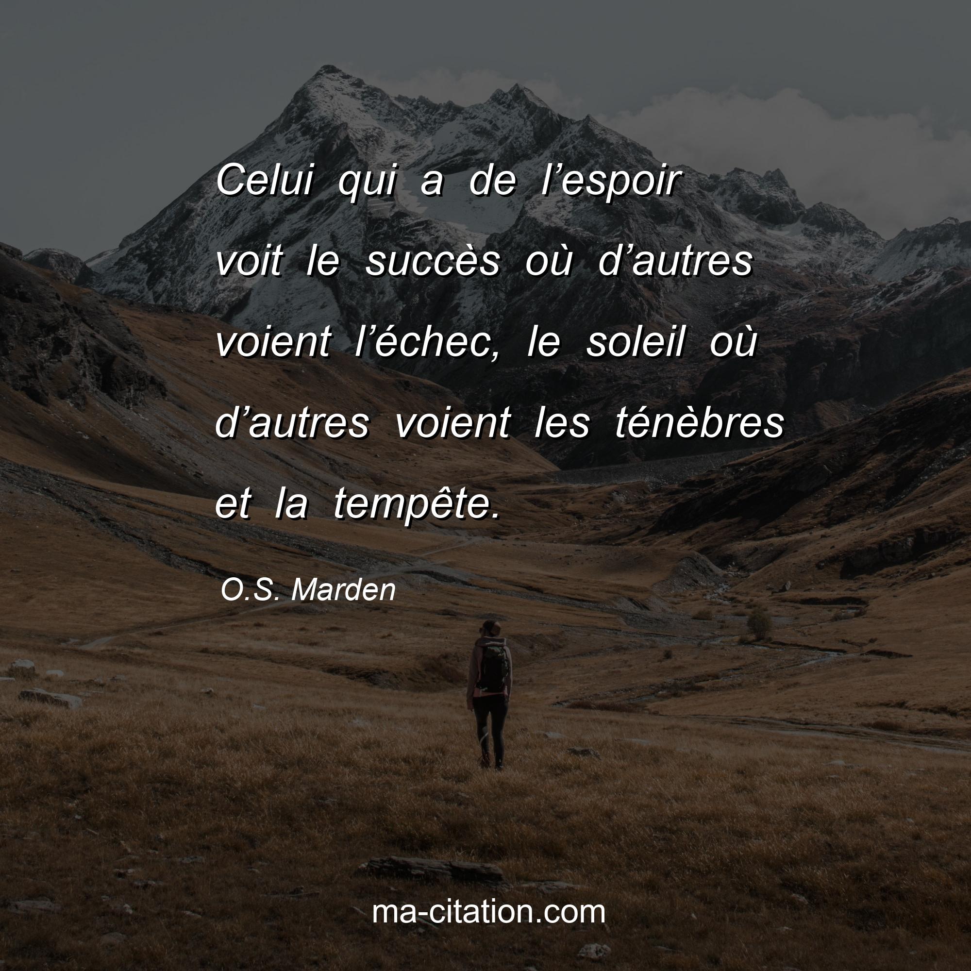 Citation sur la vie d'O.S. Marden :Celui qui a de l’espoir voit le succès où d’autres voient l’échec, le soleil où d’autres voient les ténèbres et la tempête.