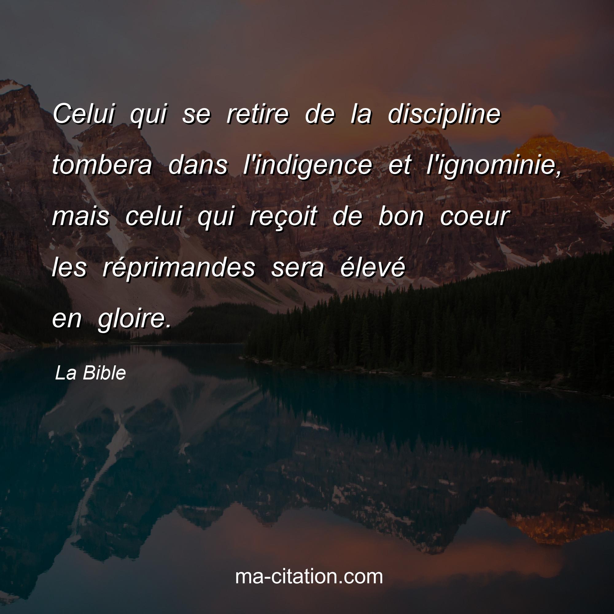 Citation sur la vie de La Bible :Celui qui se retire de la discipline tombera dans l'indigence et l'ignominie, mais celui qui reçoit de bon coeur les réprimandes sera élevé en gloire.
