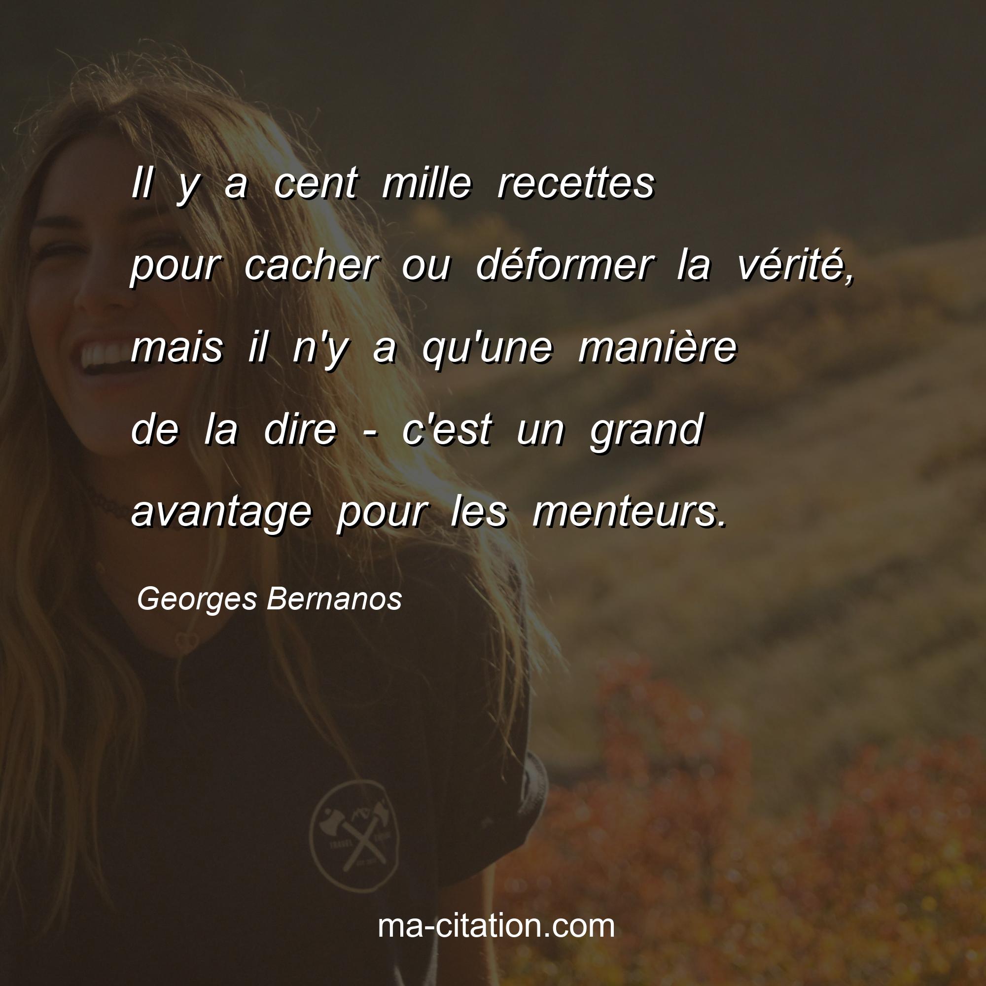 Citation sur la vie de Georges Bernanos :Il y a cent mille recettes pour cacher ou déformer la vérité, mais il n'y a qu'une manière de la dire - c'est un grand avantage pour les menteurs.