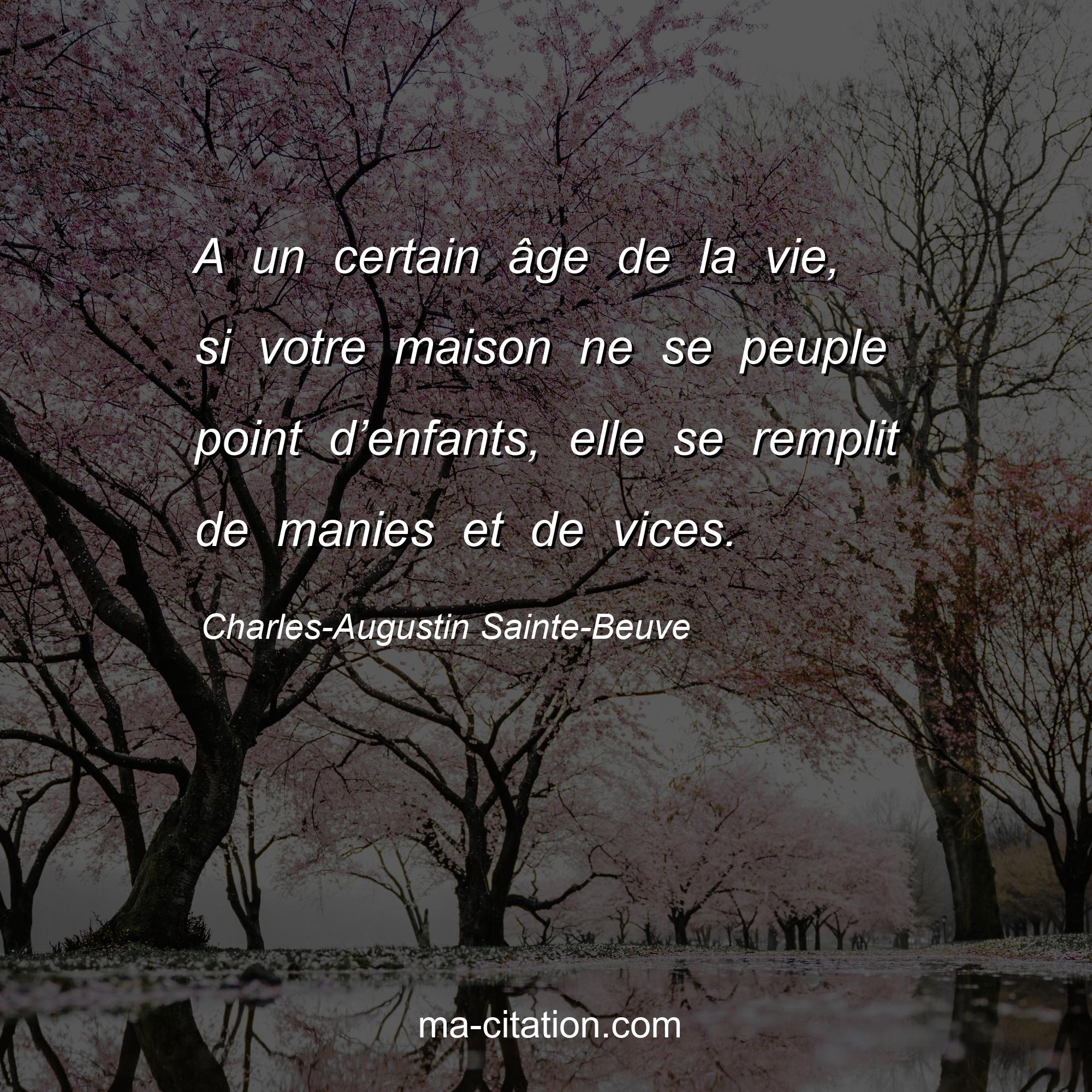 Citation sur la vie de Charles-Augustin Sainte-Beuve :A un certain âge de la vie, si votre maison ne se peuple point d’enfants, elle se remplit de manies et de vices.